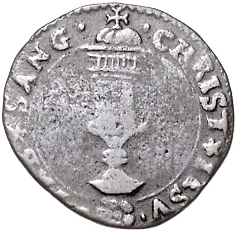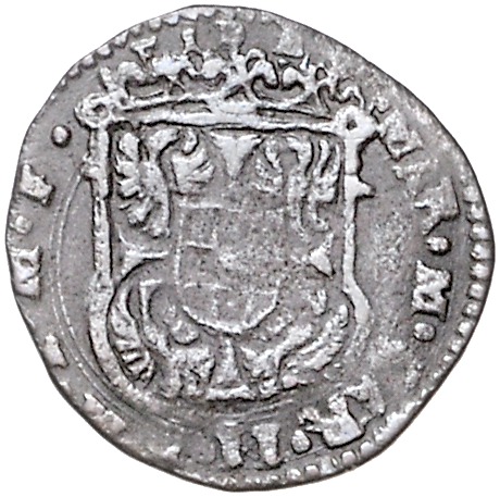 Carlo II. unter Vormundschaft seiner Mutter Maria Gonzaga 1637-1647. Soldo MAR.M.CAR.II.D.M.E.M.F. / .TAB*SANG. .CHRIST*IESV. Mz. Blume. CNI 30. 2,33 g. f.ss