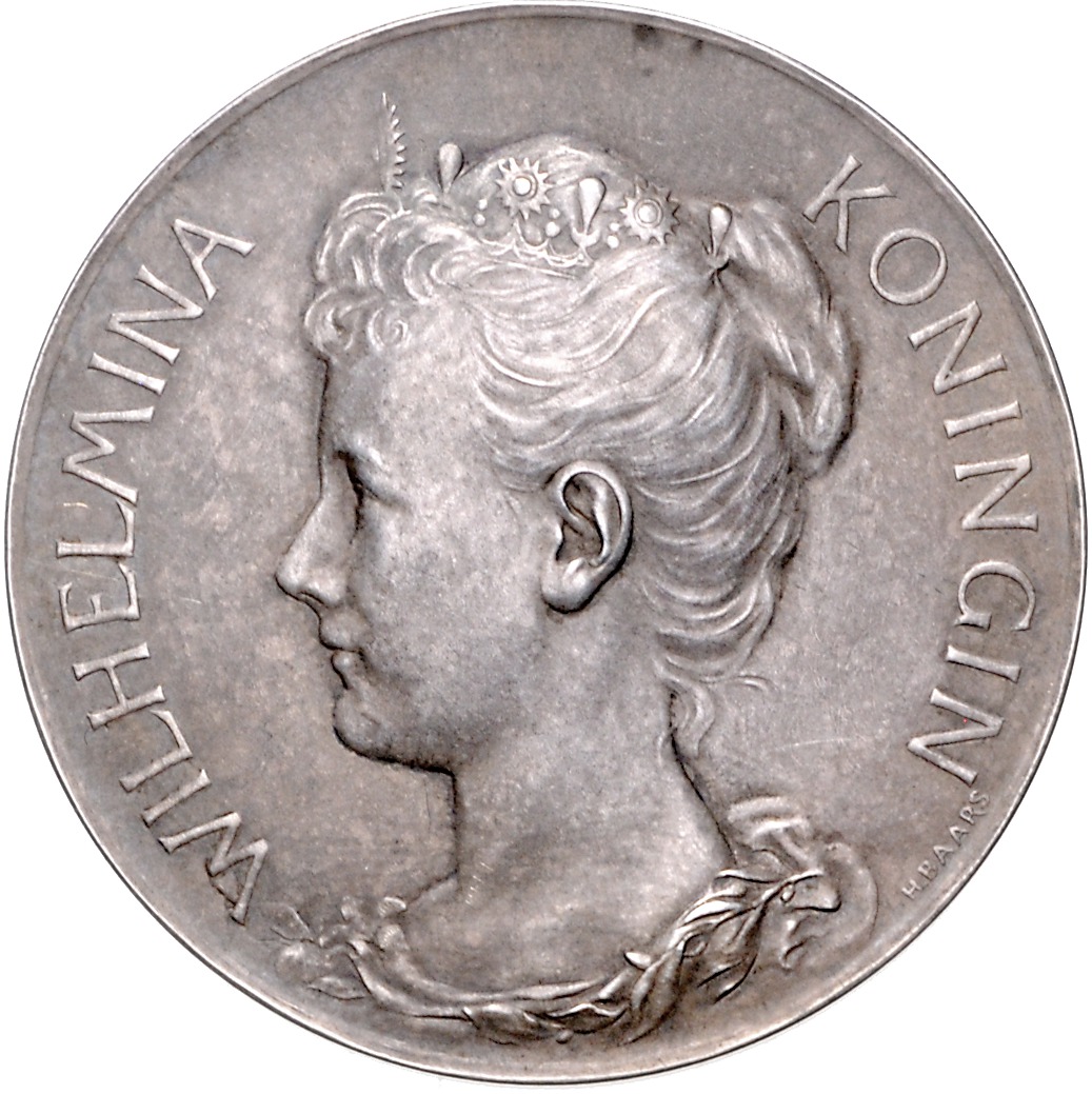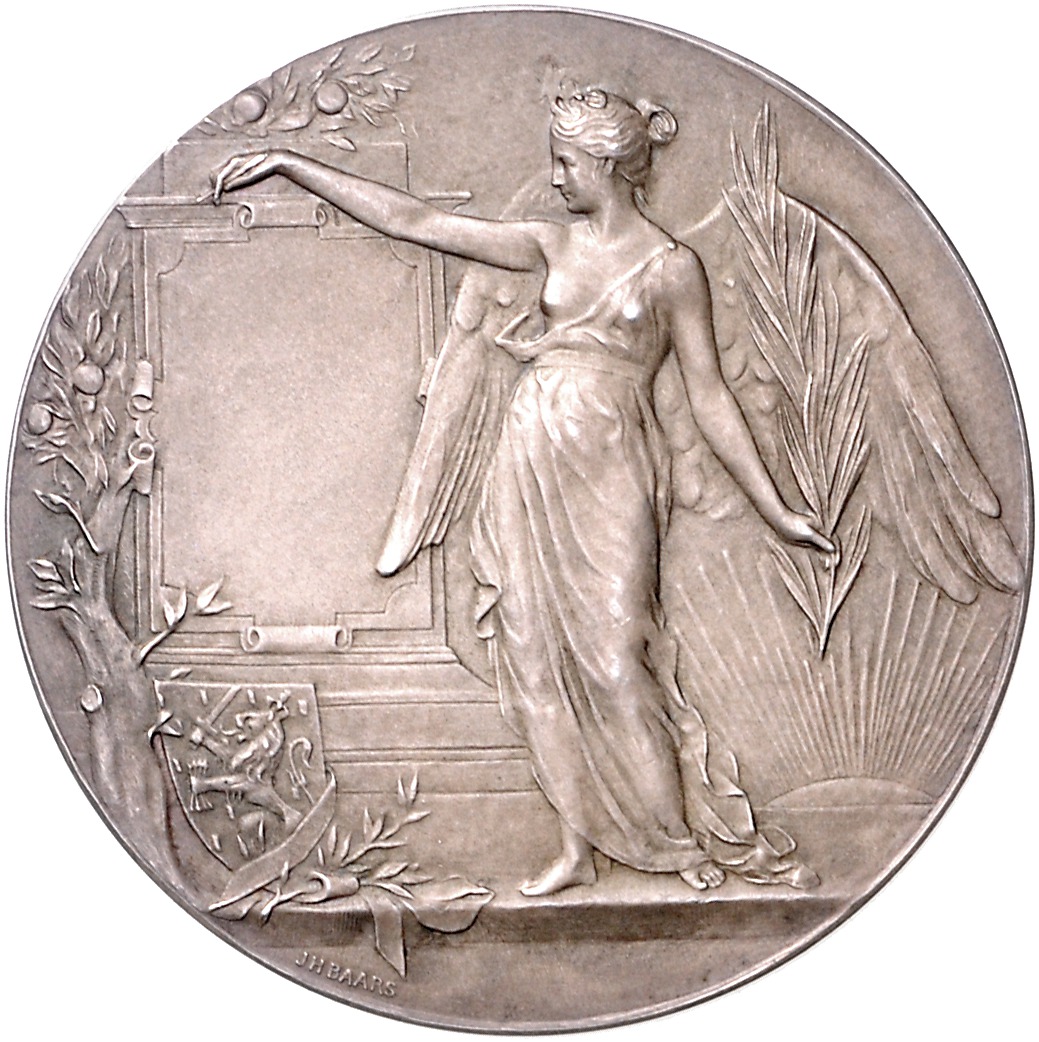 Wilhelmina I. 1890-1948. Silbermedaille o.J. (v. Baars) Preismedaille mit leerem Gravurfeld, i.Rd: geflügelter Merkurstab. 44,7 mm, 50,04 g. vz
