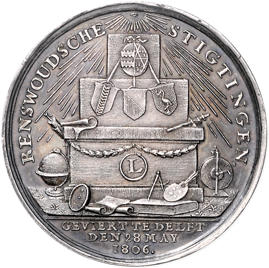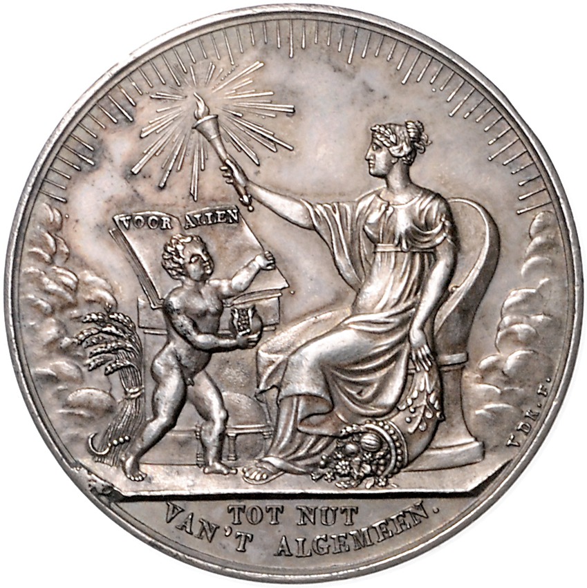 - Beschreibung: Lots. Lot von 4 Silbermedaillen (v. van der Kellen): 1834, auf das 50-jährige Bestehen der Gesellschaft zum Wohl der Allgemeinheit. Dirks 496. 36,5mm 14,13g | 1806, auf das 50-jährige Bestehen der Stiftung von Renswoude. 38,4mm 19,06g | 1835, auf die Genesung des Kronprinzen Wilhelm. Dirks 507. 32,3mm 10,93g | 1843, auf die Einweihung der Handelsakademie in Delft. 36,1mm 12,88g. meist vz