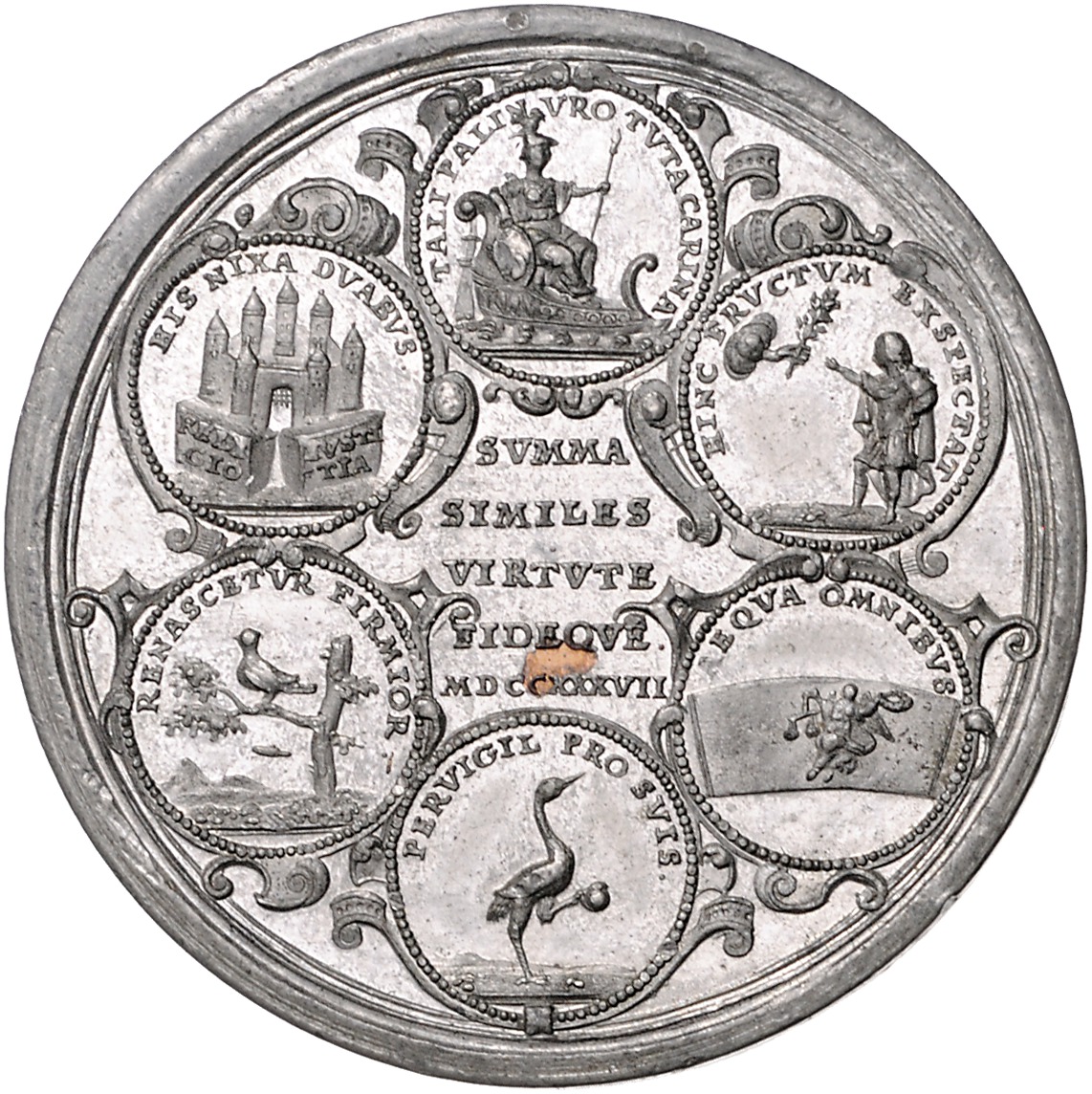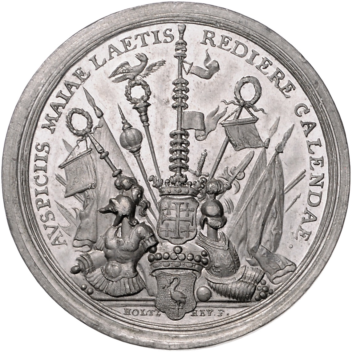 Zinnmedaille 1737 (v. Holtzhey) auf die Aufstellung des Maibaums durch die Miliz. van Loon vgl. 122. mit Kupferstift 49,0 mm, 33,65 g. vz