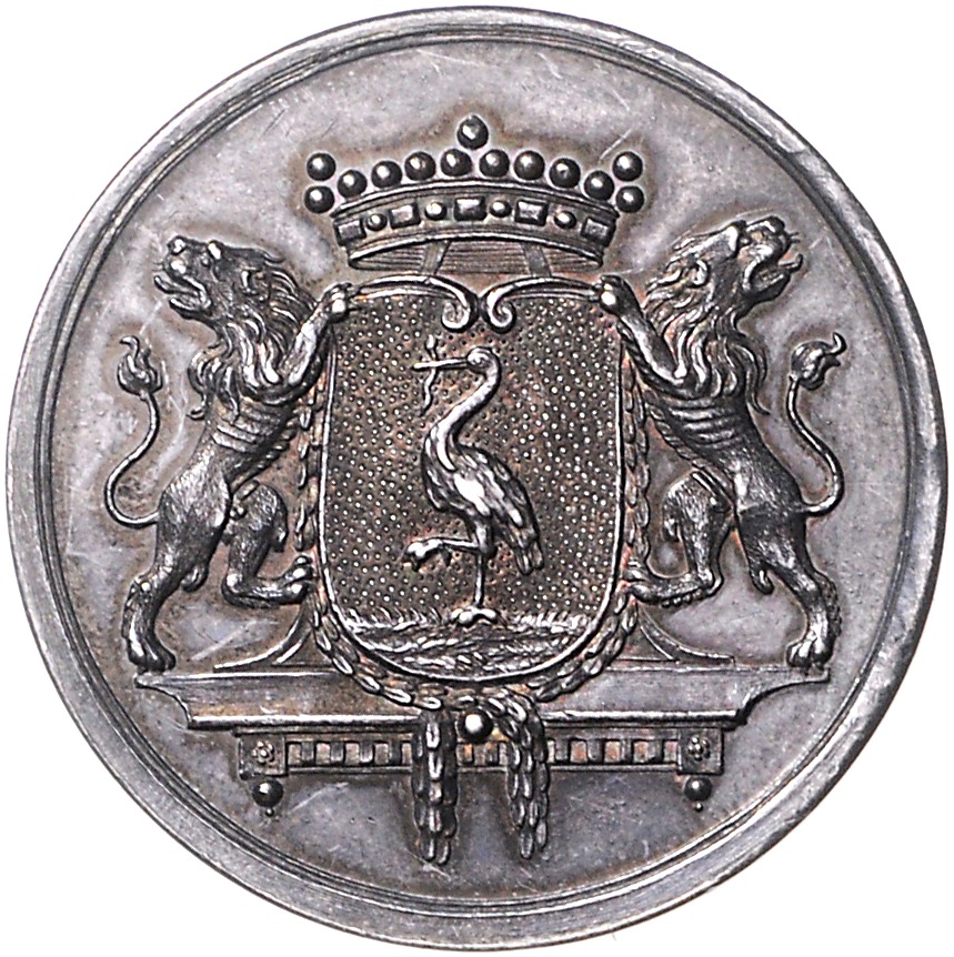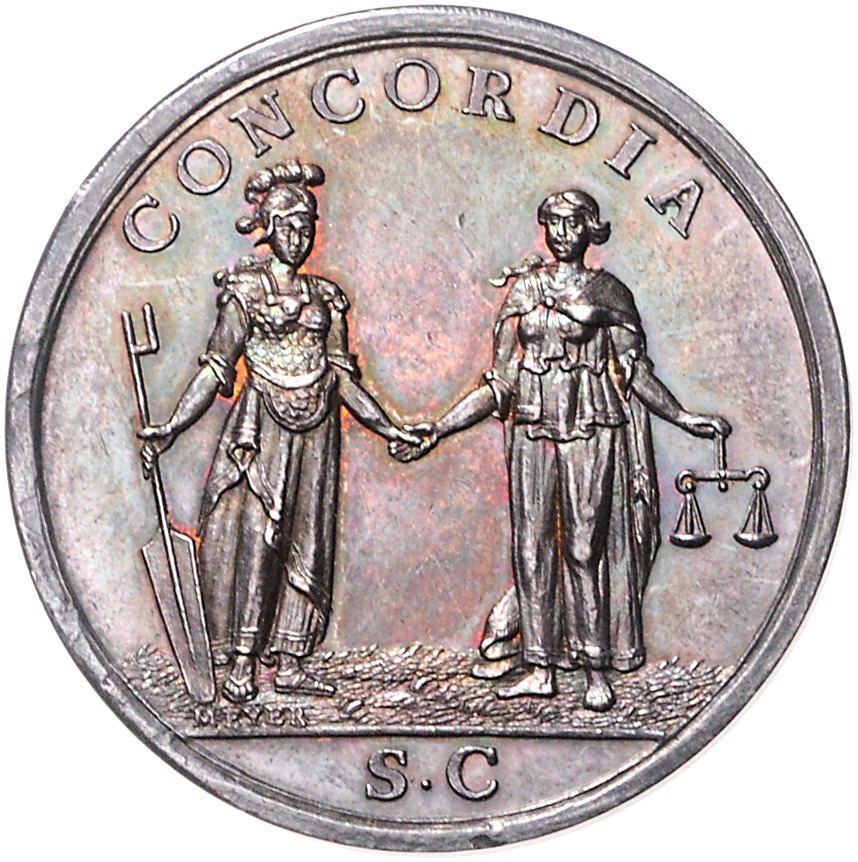 Silbermedaille o.J. (um 1786 v. Meyer) CONCORDIA S.C. / Wappen, beide Löwen blicken rückwärts nach außen. kl. Rf., herrliche Patina 36,0 mm, 19,19 g. vz
