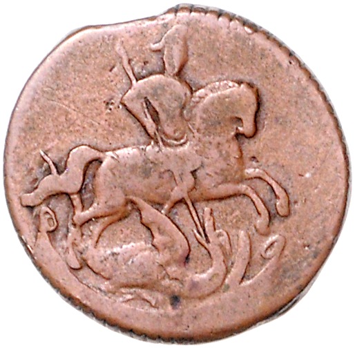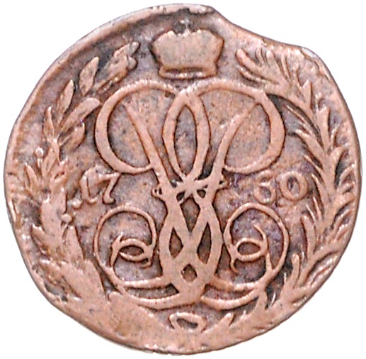 Elisabeth I. Petrowna 1741-1761. Denga 1760 Ekaterinburg. Bitkin 501. Zainende, angeblich nur 326 Exemplare geprägt, mit altem Unterlagszettel von Alain Baron, Genf. Sehr selten!. f.ss