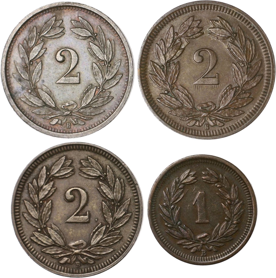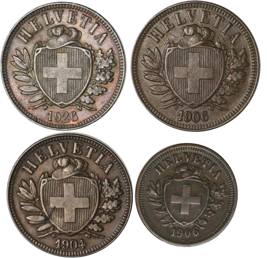Lot von 4 Stücken: 1 Rappen 1906 | 3x 2 Rappen 1904, 1906 und 1926. HMZ 1234,1236. ss