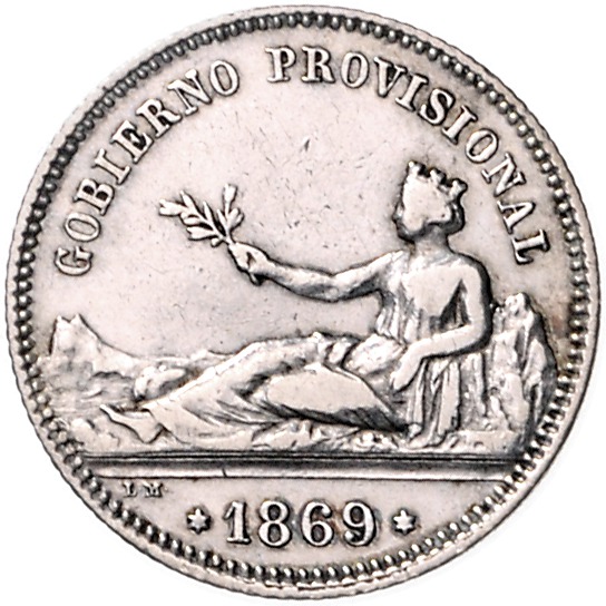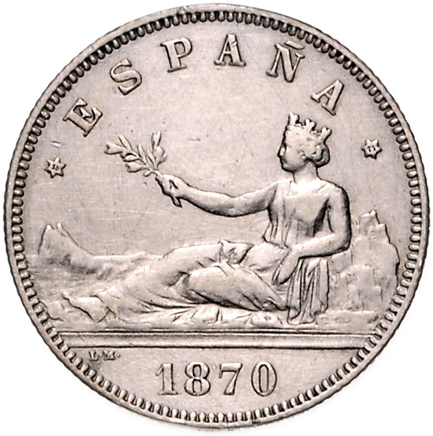 Provisorische Regierung 1868-1871. Lot von 4 Stücken: 1 Peseta 1869, 2 Pesetas 1870 und 2 u. 5 Gramos 1870. K.M. 652,654,661,662. ss
