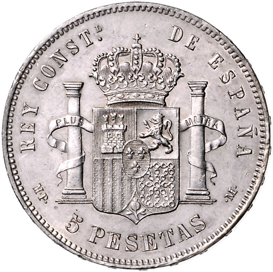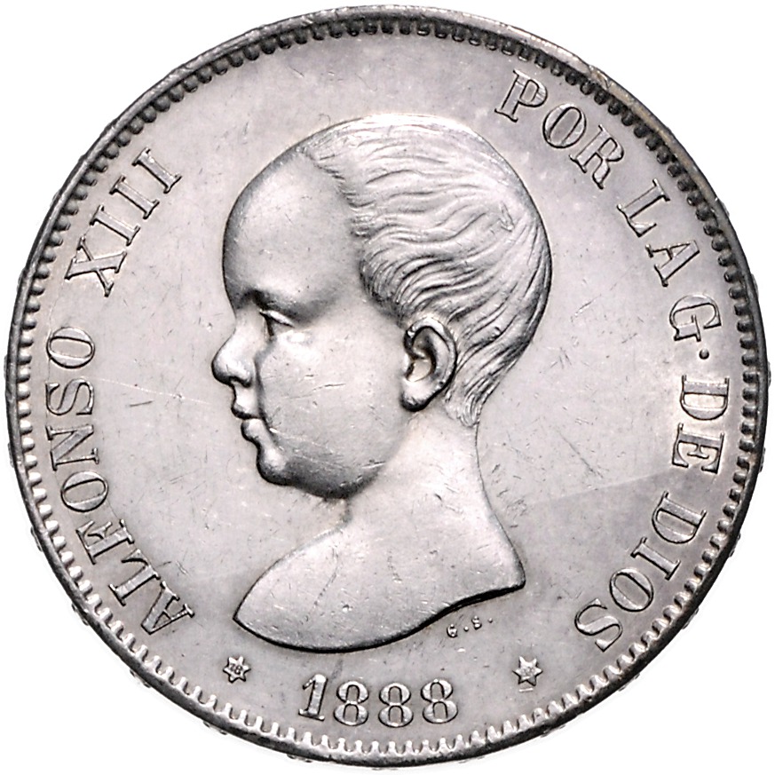 Lots. Lot von 5 Stücken: ALFONSO XII. 2 Pesetas 1882(82) | 10 Centimos 1878 | 5 Centimos 1877 (zap.) | ALFONSO XIII. 5 Pesetas 1888 (88) MP-M | 50 Centimos 1892 (92) PG-M. K.M. 678.2,675,674,689,690. ss bis f.vz
