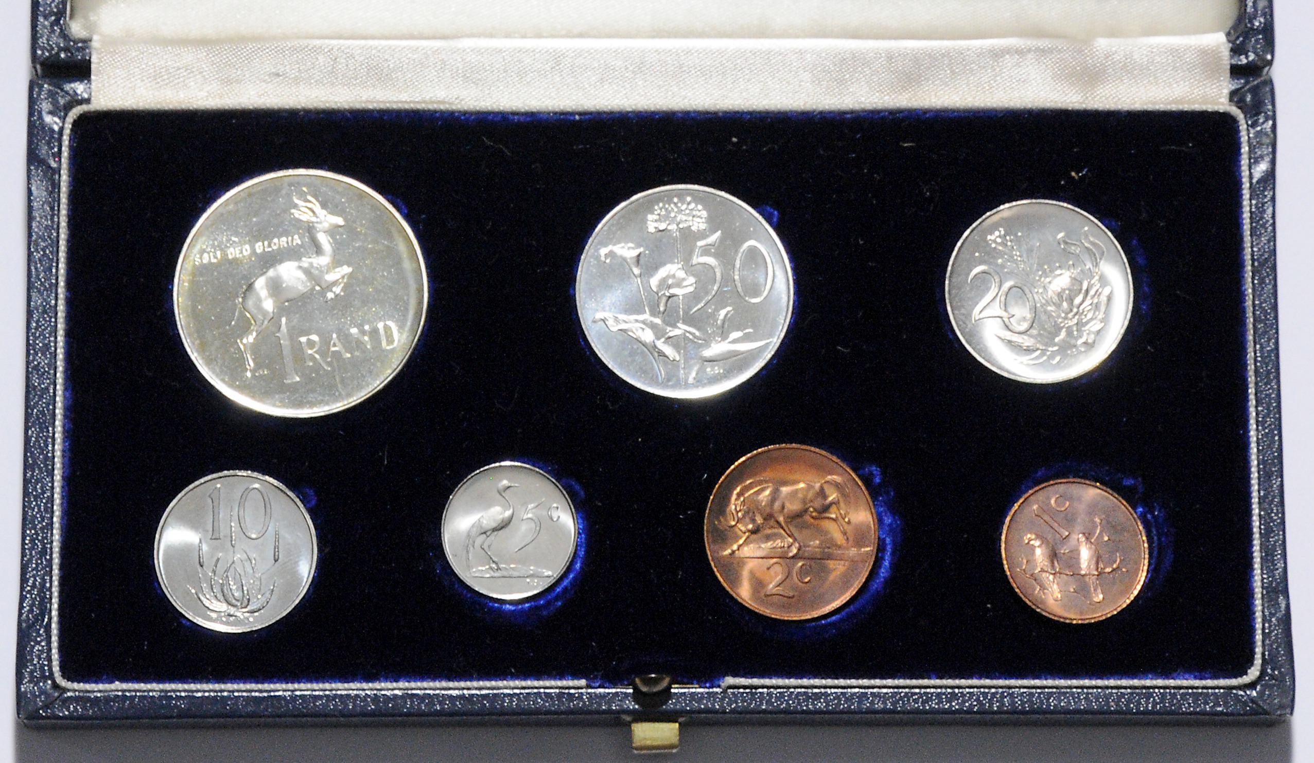 Republik nach 1961. Münzsatz 1966 bestehend aus 7 Stücken: 1 Rand u. 50, 20, 10, 5, 2, und 1 Cent. K.M. PS67. in Originaletui. PP