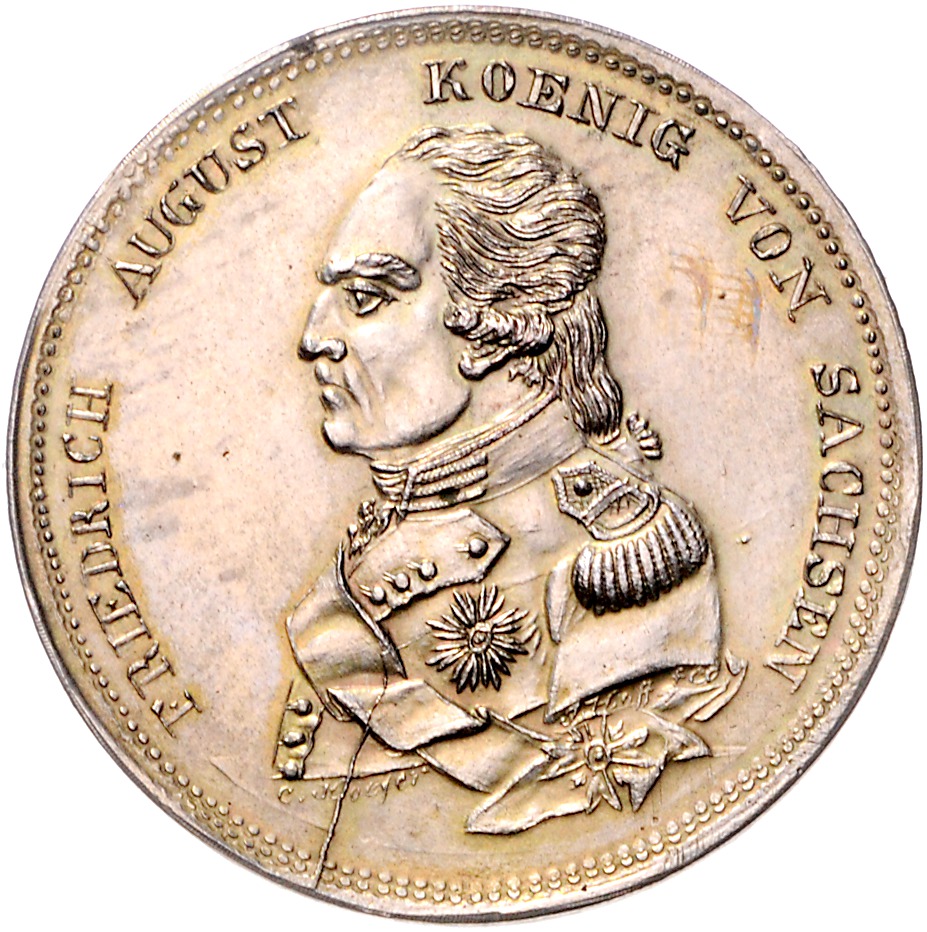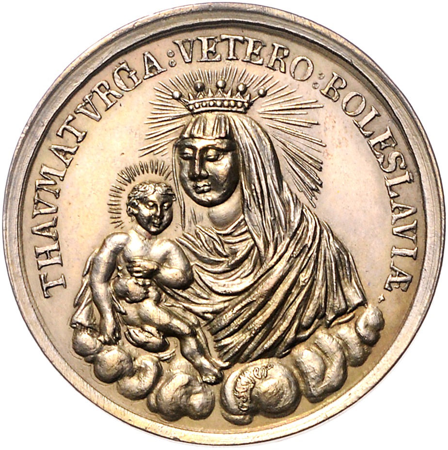- description: Versilberte Bronzemedaille o.J. (1817?) (v. C. Hoefer) auf die Stadt Altbunzlau (Stara Boleslav) als Wallfahrtsort wegen der von König Mathias 1617 gegründeten Kirche der wundertätigen Mutter Gottes. Gekrönte Mutter Gottes mit Jesuskind / Friedrich August König von Sachsen. Ähnlich den Talern von 1817 (vgl. AKS 22/23). Mit altem Beschreibungstütchen des Sammlers. Slg. Donebauer 4094 (Zinn). 39,8 mm, 24,27 g. vz