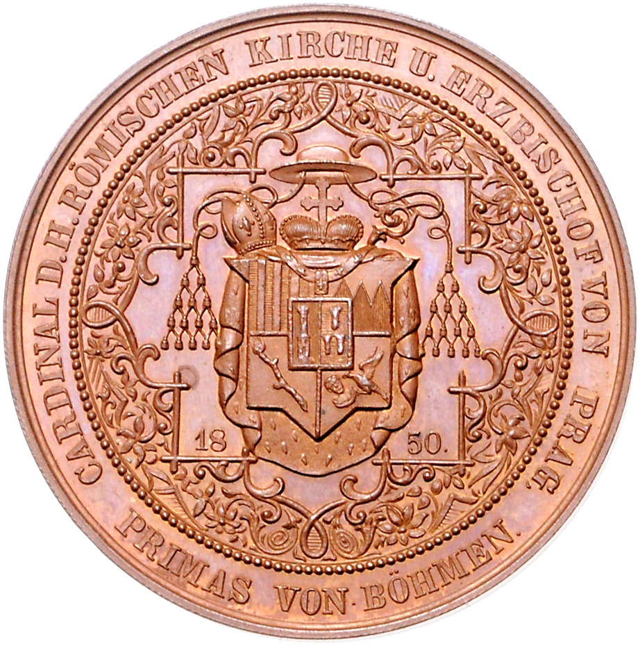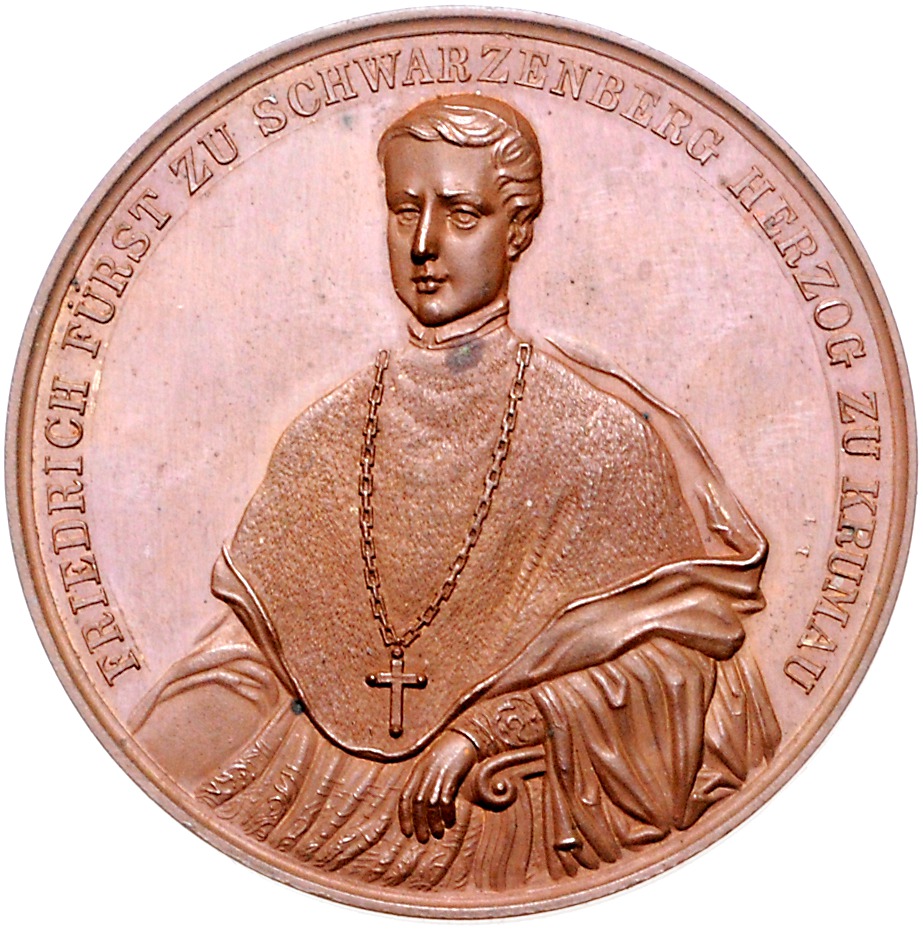 Friedrich zu Schwarzenberg 1850-1885. Bronzemedaille 1850 (v. Drentwett) auf seine Inthronisation. Donebauer 4674. 39,7 mm, 29,55 g. vz-st