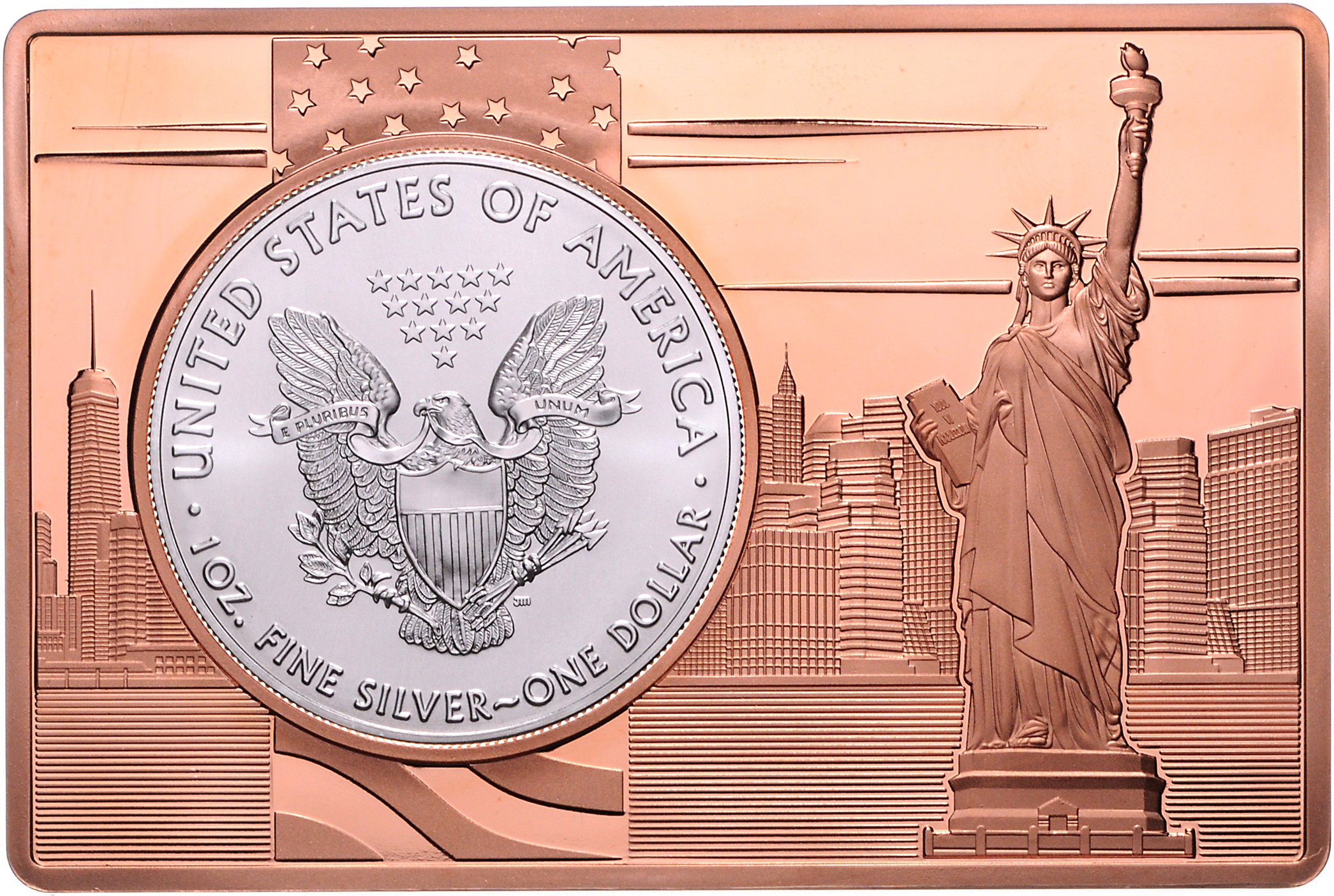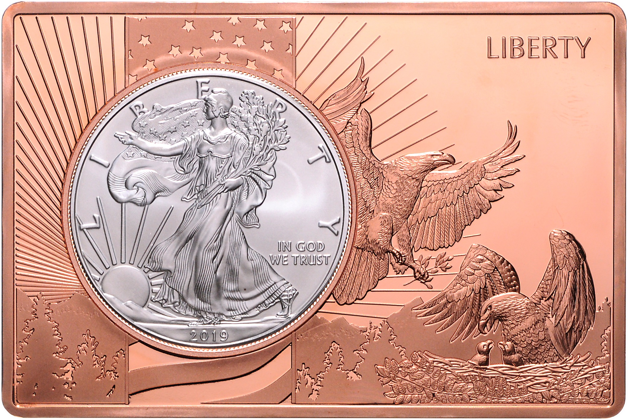Walking Liberty Bar 2019 1 Unze-Silbermünze in 3 Unzen-Kupferbarren. Auflage 5000 Stück, in Originalverpackung. st