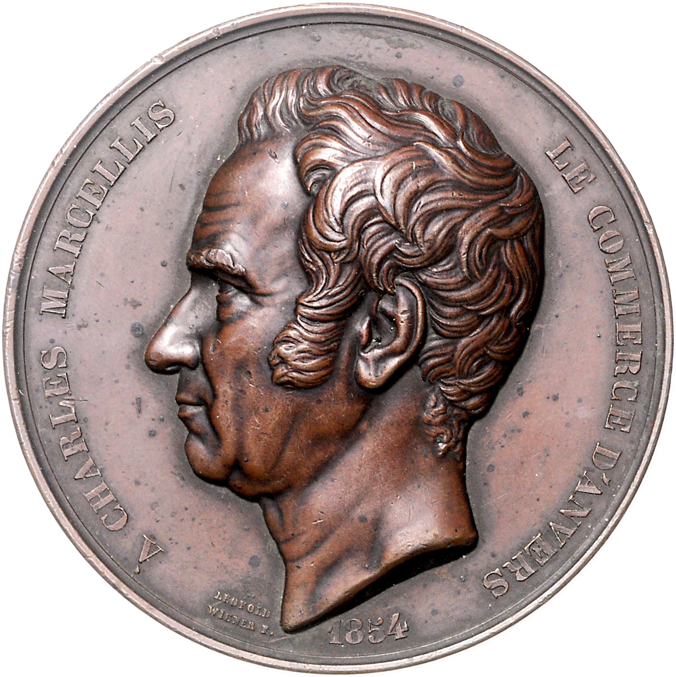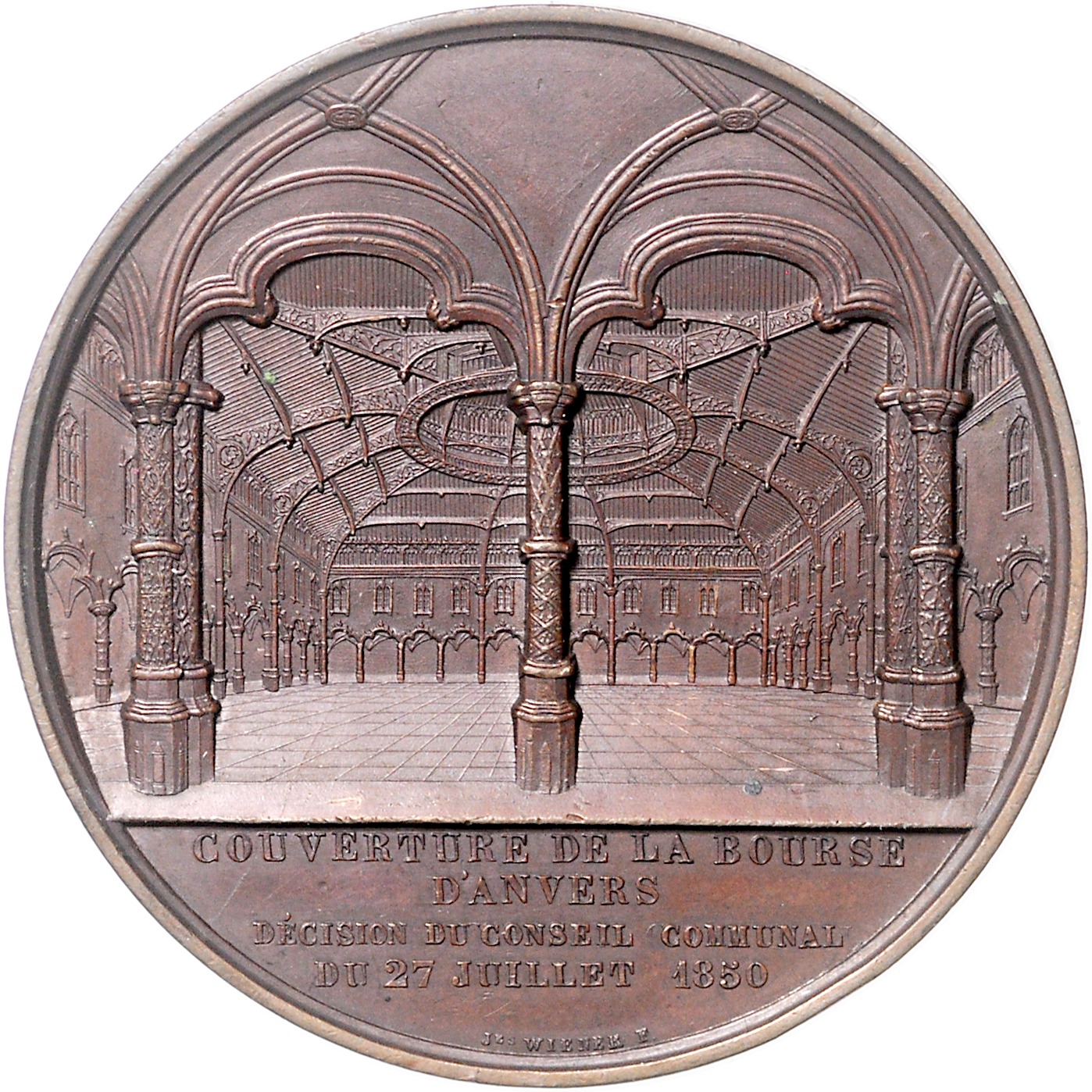 Bronzemedaille 1854 (v. Leopold u. Jacques Wiener) auf die Fertigstellung der gusseisernen Kuppeldecke der Börse zu Antwerpen. Hoydonck 117. 60,1 mm, 101,54 g. f.vz
