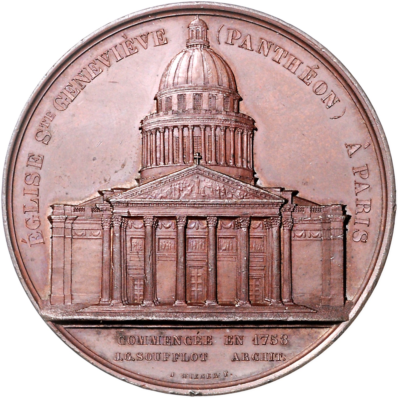 Bronzemedaille 1858 (v. Jacques Wiener) auf das Panthéon, auf dem Hügel der heiligen Genoveva in Paris (5. Arrondissement) die nationale Ruhmeshalle Frankreichs und die Grabstätte berühmter französischer Persönlichkeiten. Hoydonck 159. 59,7 mm, 91,30 g. vz