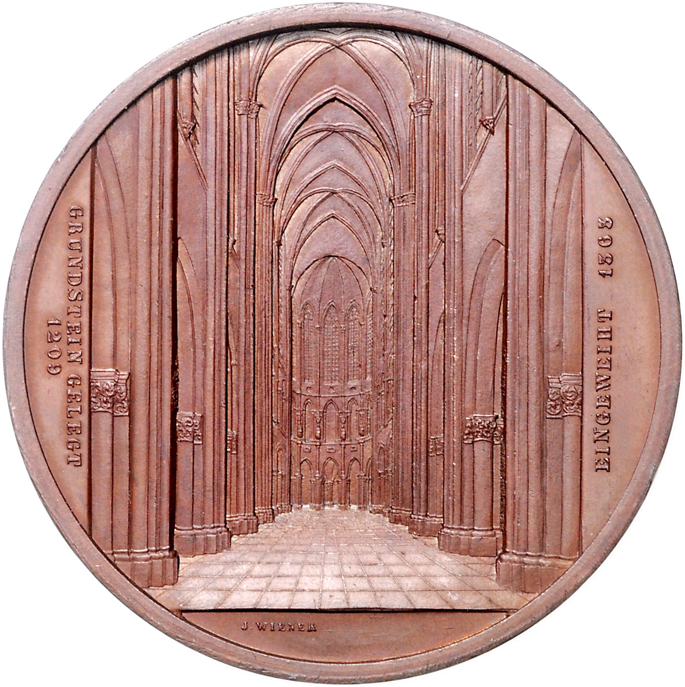 Bronzemedaille o.J. (1865) (v. Jacques Wiener) auf den Dom zu Magdeburg. Hoydonck 210. kl. Patinafleck 58,8 mm, 89,44 g. vz