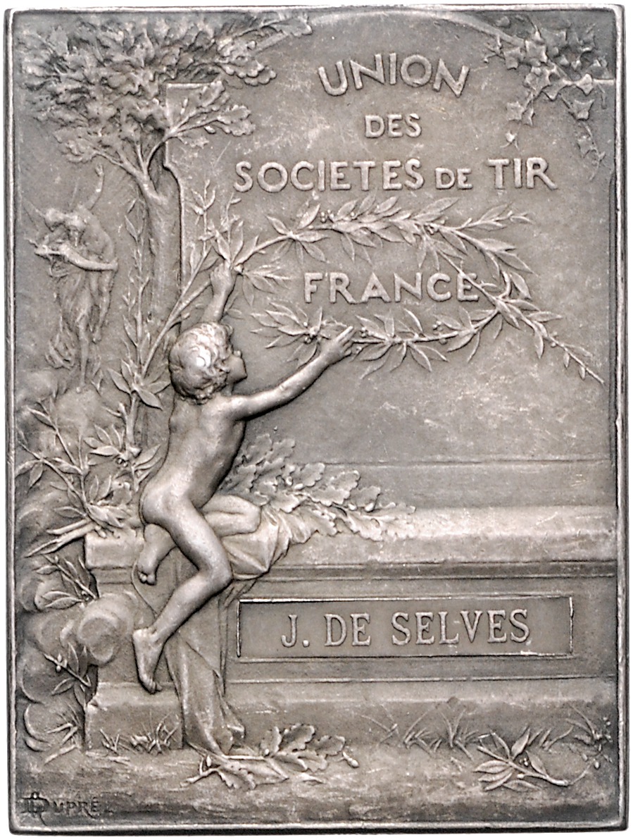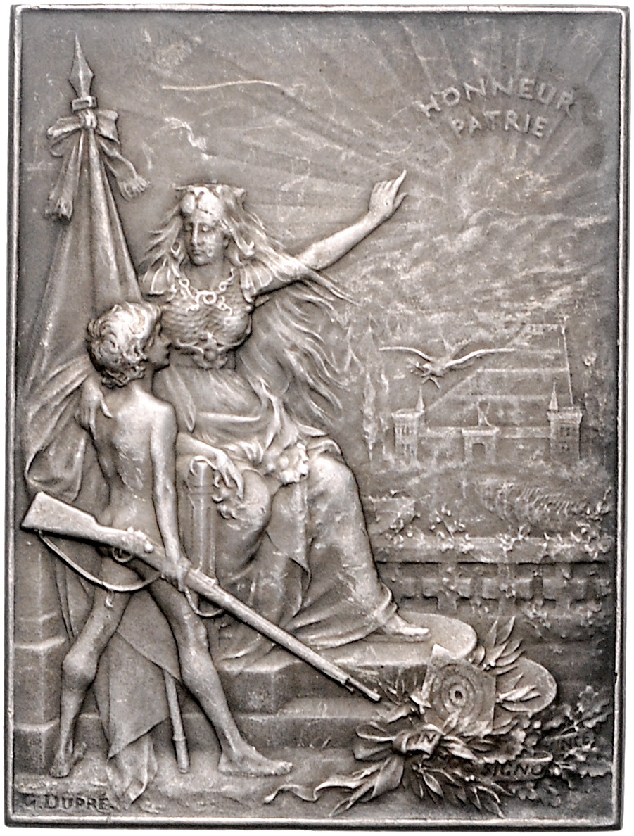 Versilberte Bronzeplakette o.J. (v. Dupre) HONNEUR PATRIE Prämie des Nationalen Verbands der Schützenvereine Frankreichs, mit Verleihungsgravur, i.Rd: Füllhorn BRONZE. 38,4x51,1 mm 36,49 g. vz