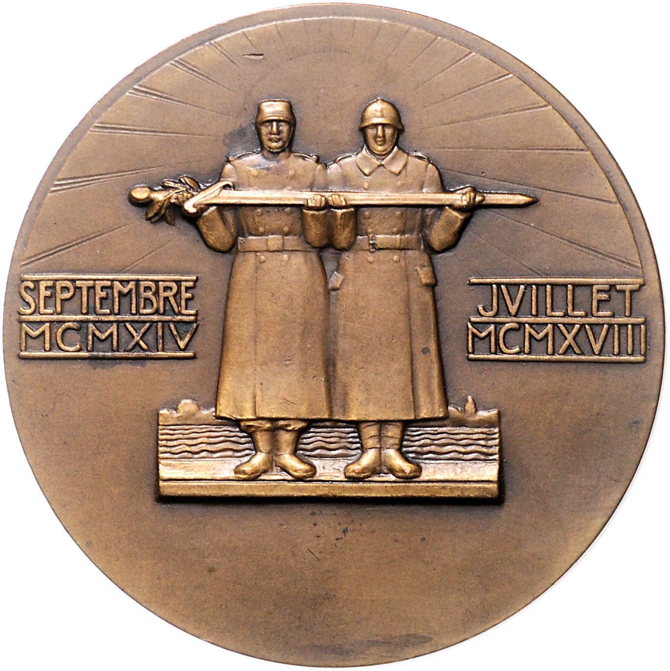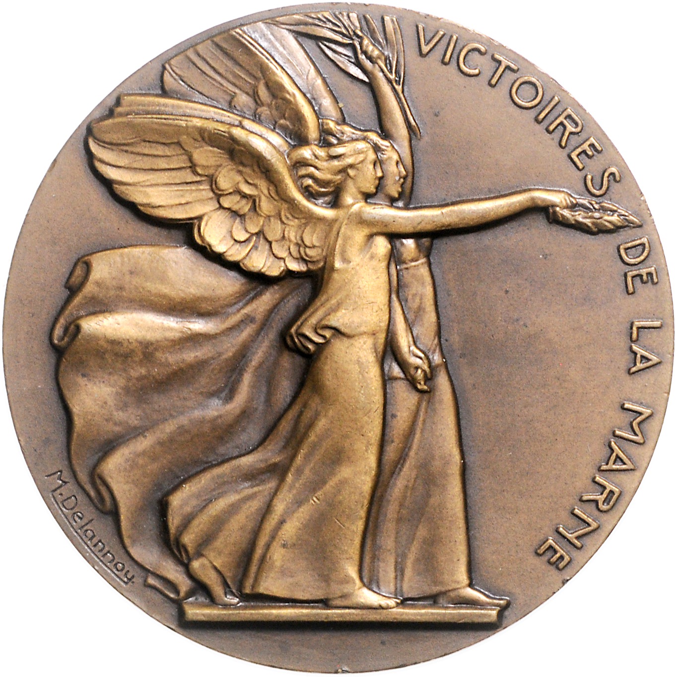 Bronzemedaille 1918 (v. Delannoy) VICTOIRES DE LA MARNE, i.Rd: Füllhorn BRONZE. 58,6 mm, 95,22 g. prfr.
