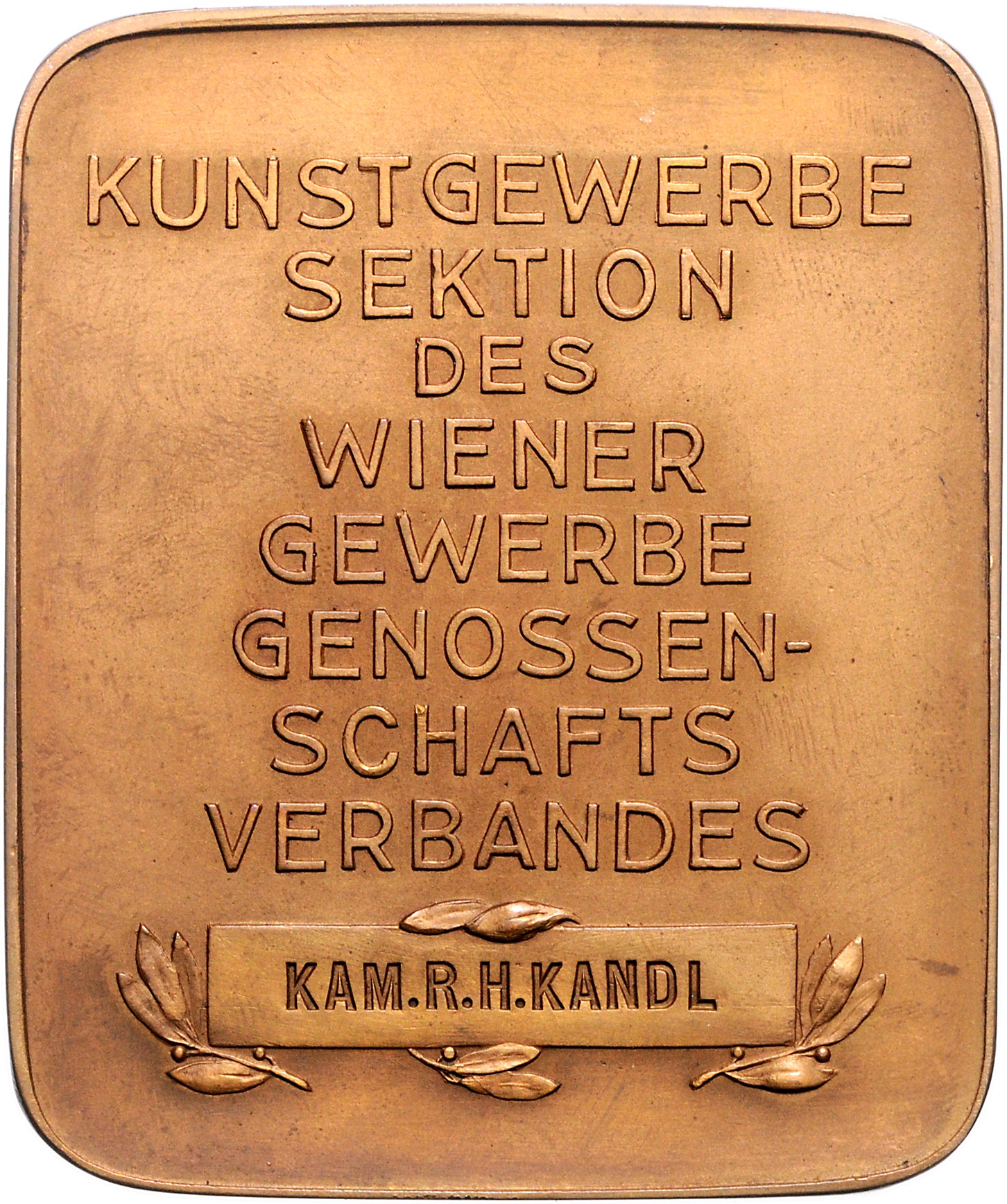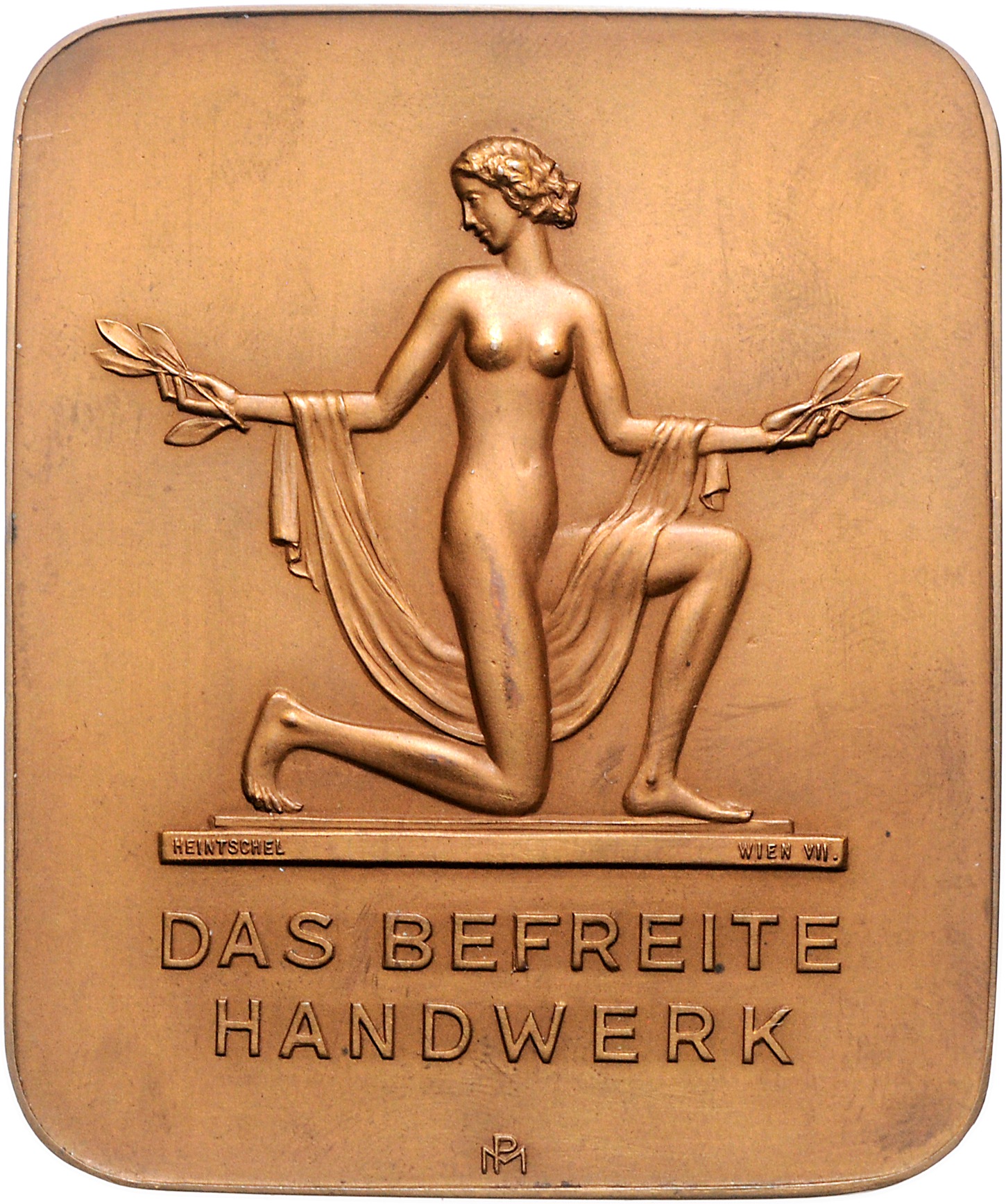 Bronzeplakette o.J. (v. Heintschel, Wien VII.) Das befreite Handwerk / Kunstgewerbesektion des Wiener Gewerbegenossenschaftsverbandes mit Gravur: KAM R. H. KANDL. 62,4x74,6 mm 121,40 g. vz+