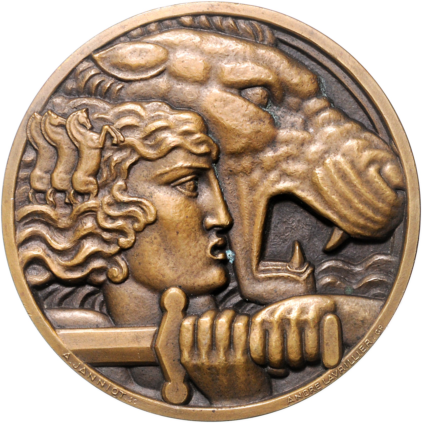 Bronzemedaille 1928 (v. Lavrillier/Janniot) auf die Enthüllung des `Monument aux morts pour la France`, i.Rd: Dreieck BRONZE. Maier 336. 72,0 mm, 181,59 g. vz