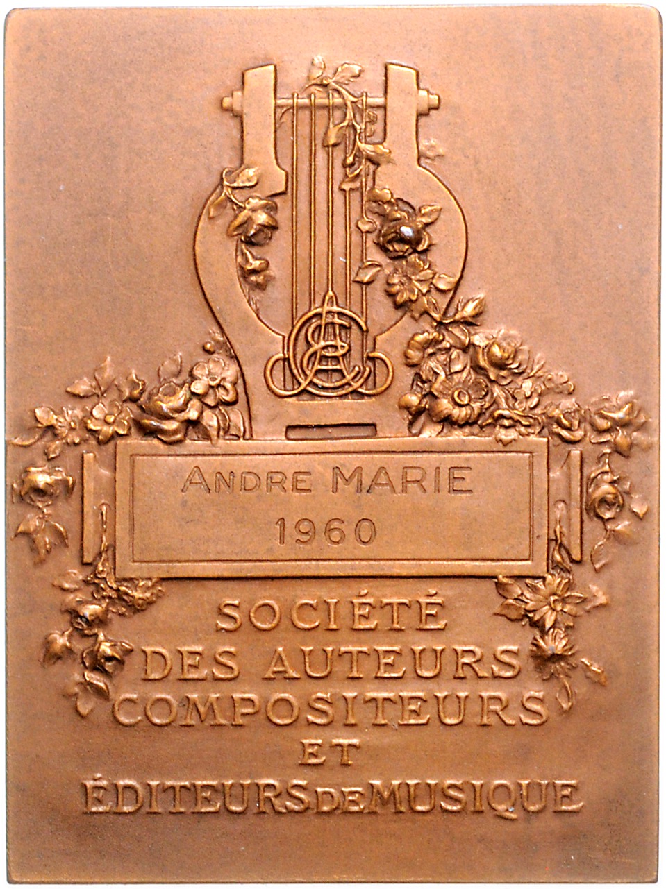 Bronzeplakette o.J., graviert 1960 (v. Dubois) als Prämie der `Société des auteurs compositeurs et editeurs de musique`, mit Verleihungsgravur, i.Rd: Füllhorn BRONZE. Forrer I, 636. 41,2x54,9mm 64,60 g. vz