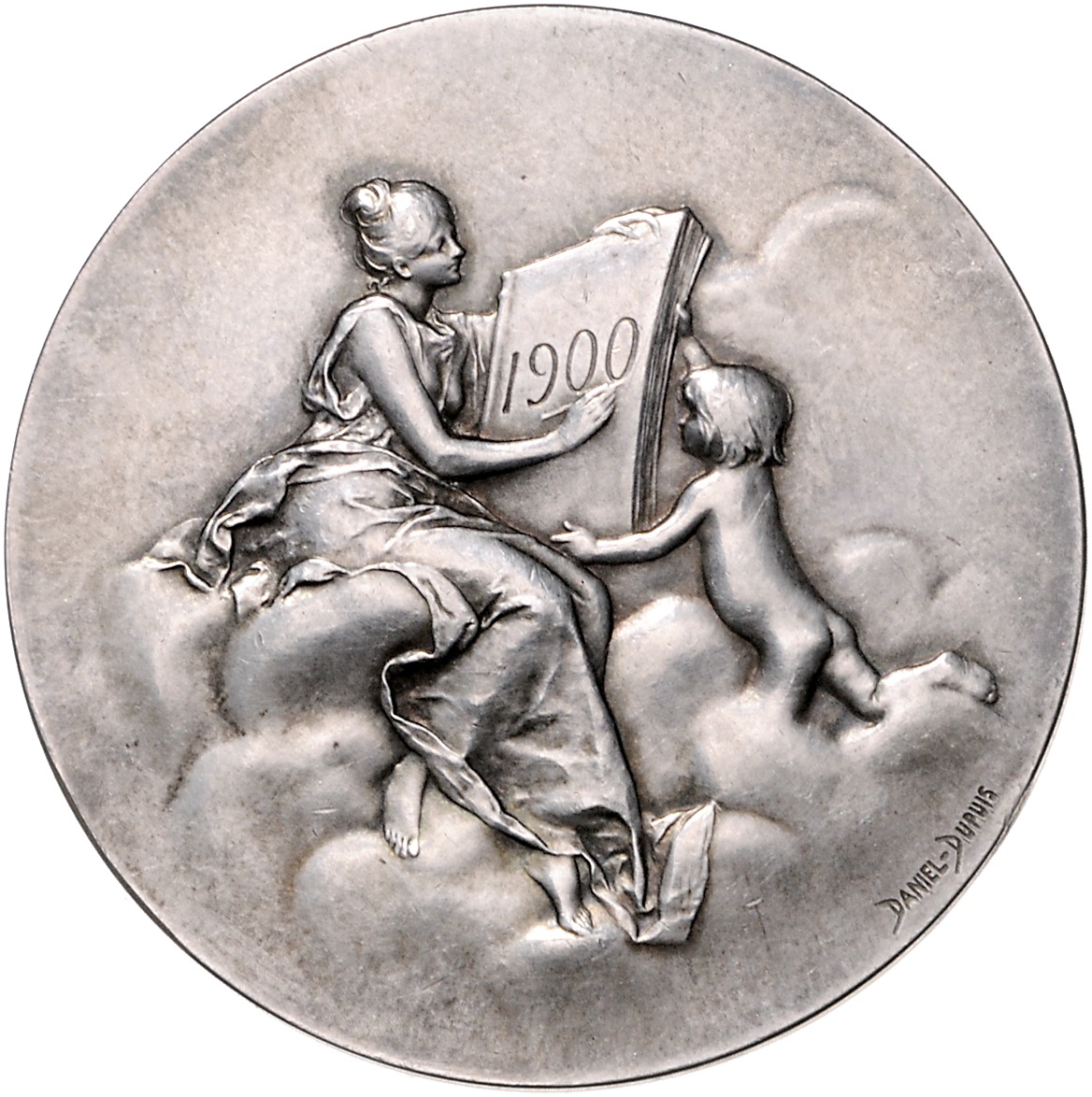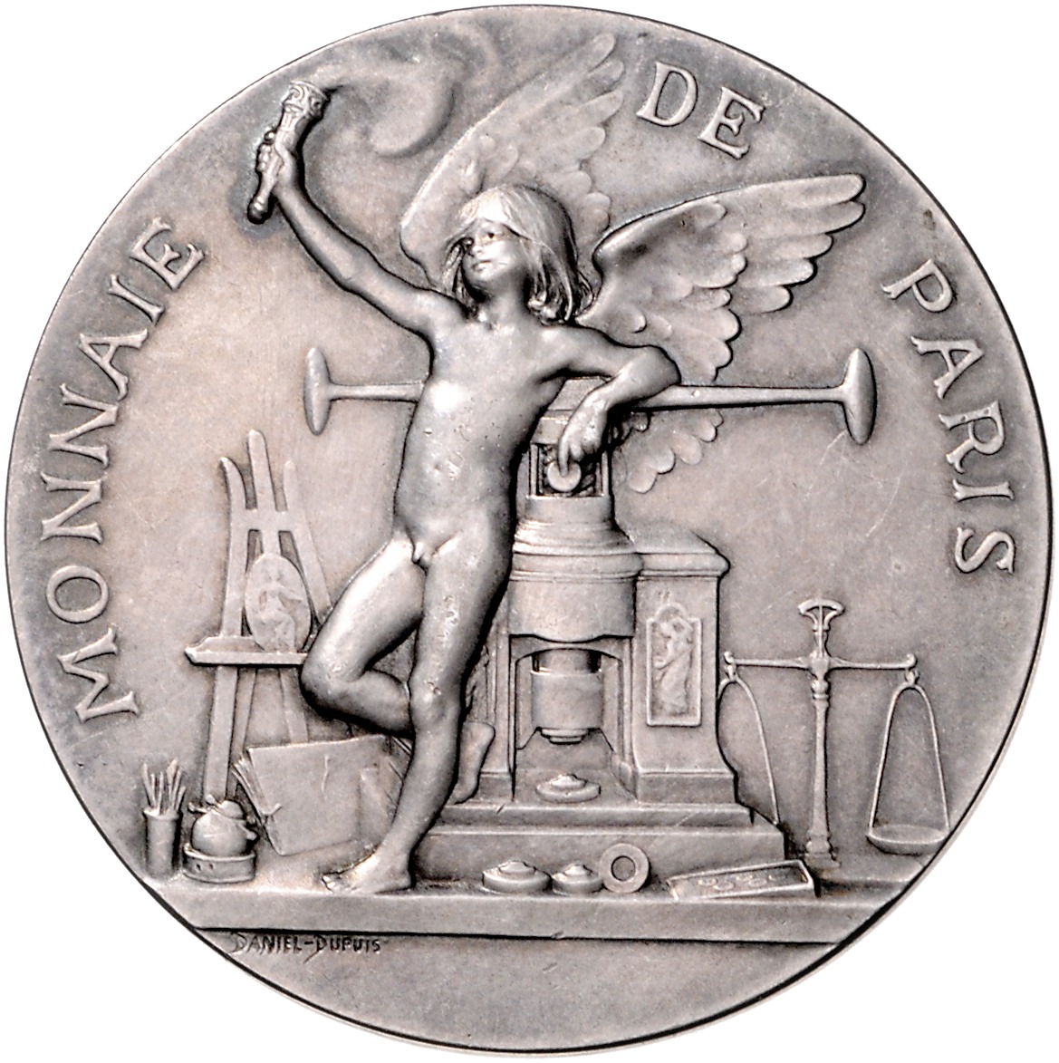 Silbermedaille 1900 (v. Dupuis) Kunstmedaille auf die Pariser Münze im Rahmen der Weltausstellung in Paris, i.Rd: Füllhorn ARGENT. f.Kr. 50,5 mm, 60,21 g. vz