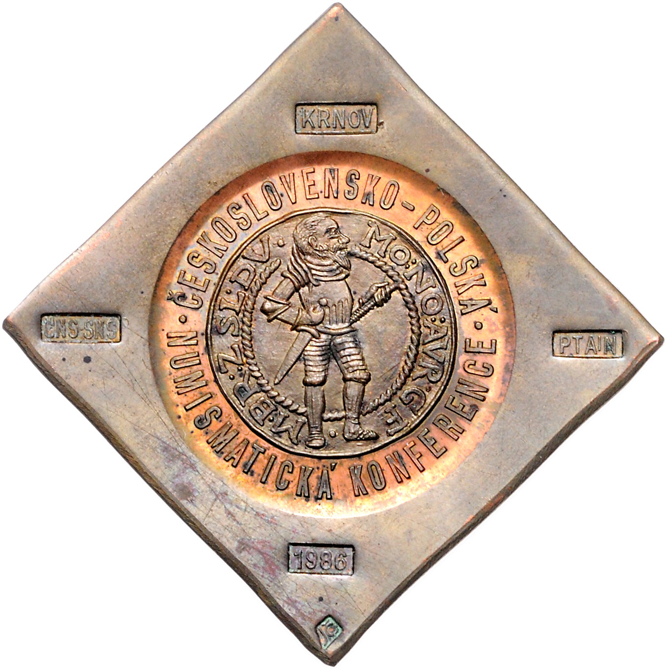 - Beschreibung: Lot von 3 Stücken: Einseitige Bronzeklippe 1986 der Tschechoslowakisch-Polnisch-Numismatischen Konferenz mit Motiv des Krnov-Dukatens von 1561. 42x42mm 23,06g | Tombakmedaille 1981 (v. Wankmüller) auf den 12. Deutschen Numismatikertag und das 16. Süddeutsche Münzsammlertreffen in München und 100 Jahre Bayerische Numismatische Gesellschaft. 39,8mm 16,24g, gelocht | Tombak-Klippe 1982 (v. Wankmüller) auf 175 Jahre Staatliche Münzsammlung München. 42x42mm 36,19g. vz und besser