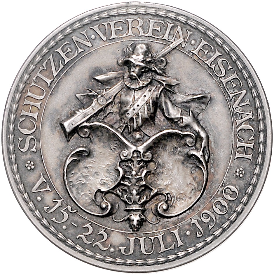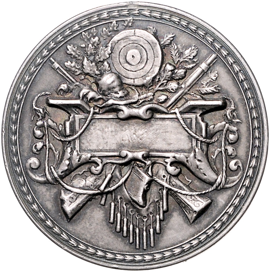 Silbermedaille 1900 (unsign.) Prämie des Schützenvereins, Rs. mit leerem Gravurfeld, i.Rd: Halbmond Krone 0,990. Peltzer -. Hklsp. 40,3 mm, 26,79 g. vz