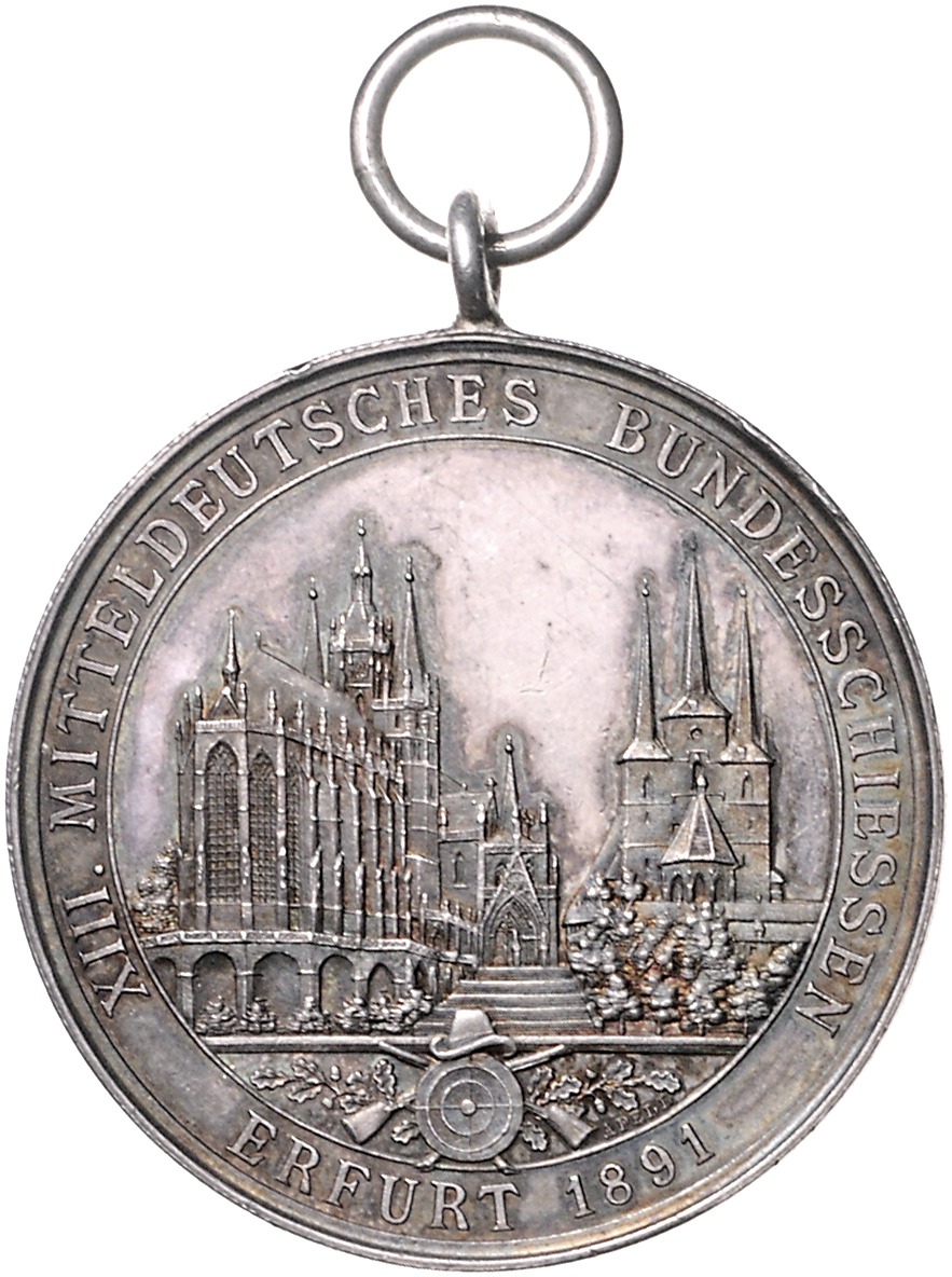 Silbermedaille 1891 (v. Drentwett) auf das XIII. Mitteldeutsche Bundesschießen. Slg. Peltzer 1047. Slg. Marienburg 7364, kl.Kr. 37,8 mm, 20,58 g. ss