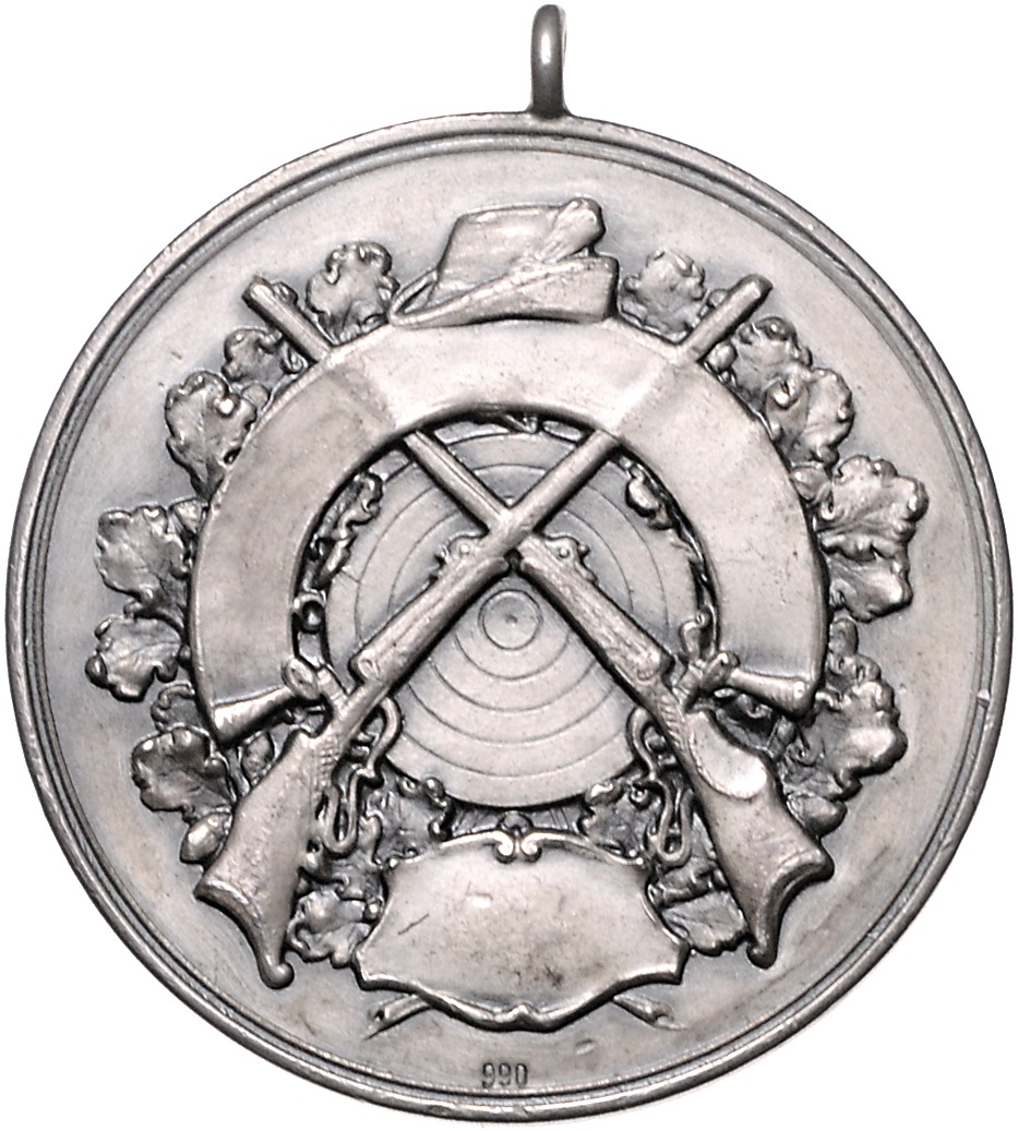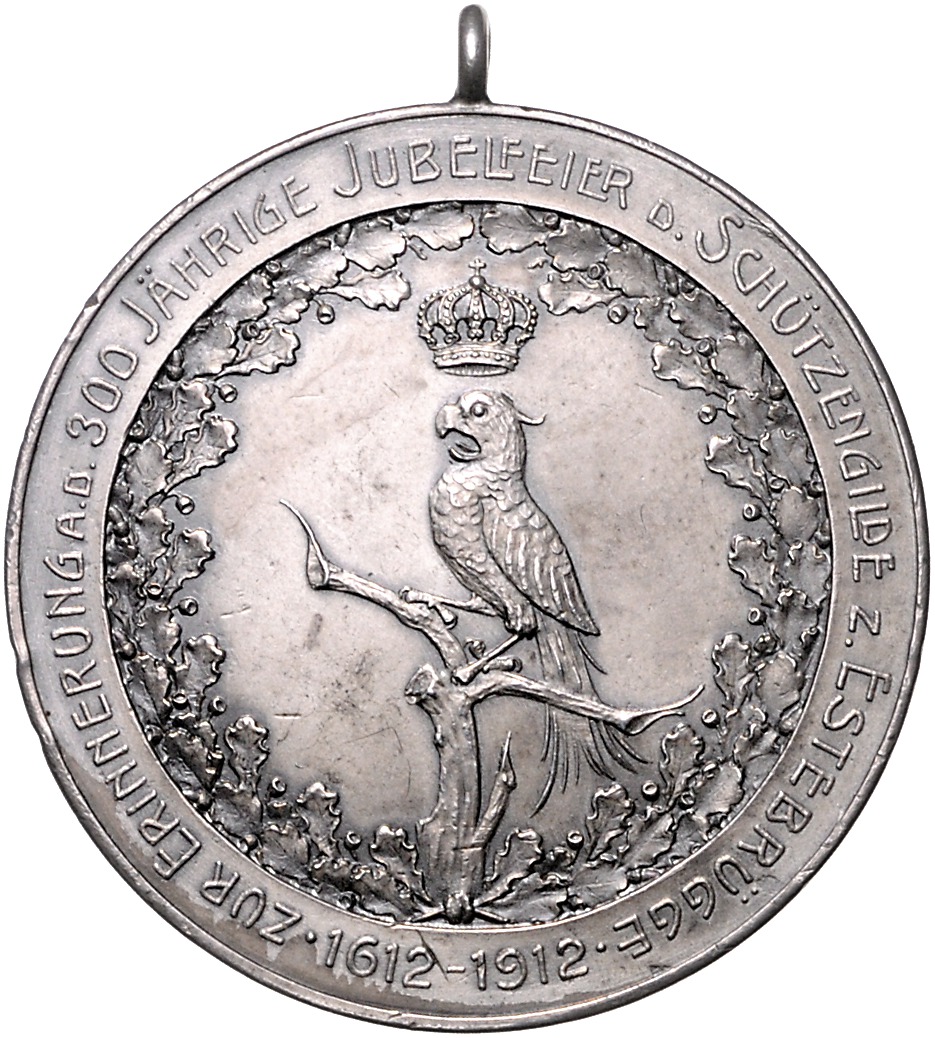 Silbermedaille 1912 (unsign.) auf die 300-jährige Jubelfeier der Schützengilde, Rs. mit leerem Gravurfeld, Punze 990. Slg. Peltzer 1059. mit Öse, kl.Kr. und Rf. 40,2 mm, 25,36 g. f.vz
