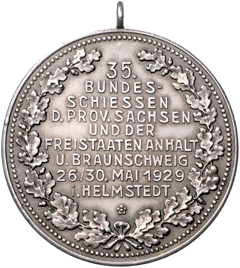 Silbermedaille 1929 (v. Oertel) auf das 35. Bundesschießen der Provinz Sachsen und der Freistaaten Anhalt und Braunschweig, i.Rd: SILBER 990. mit Öse, kl.Kr. 39,5 mm, 24,32 g. f.vz