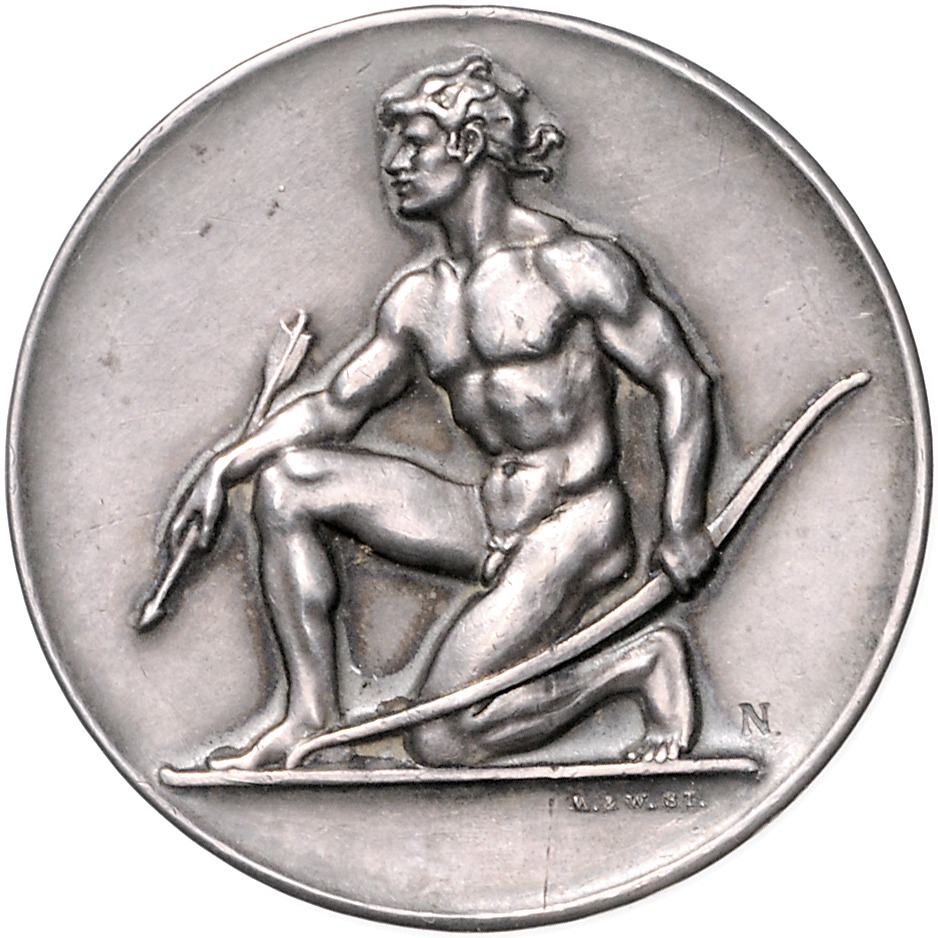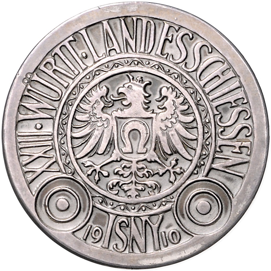 Lot von 2 Stücken Silbermedaille 1910 (v. M.&W.) auf das XXIII. Württembergische Landesschießen, i.Rd: 950 SILBER. entf. Öse, winz. Kr. 40,40 mm 24,15 g | gleiches Stück in Bronze, 40,3mm 26,92g. Kaiser 337. ss-vz und vz