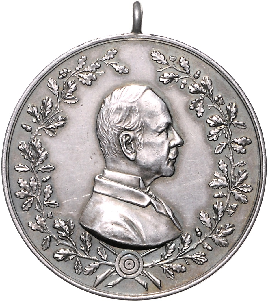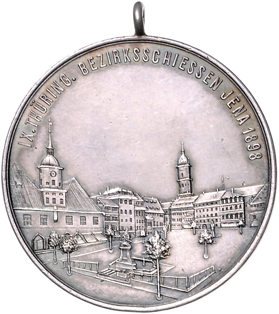 Silbermedaille 1898 (unsign.) auf das 9. Thüringische Bezirksschießen. Slg. Peltzer 1312. mit Öse, winz. Kr. 39,9 mm, 19,10 g. vz