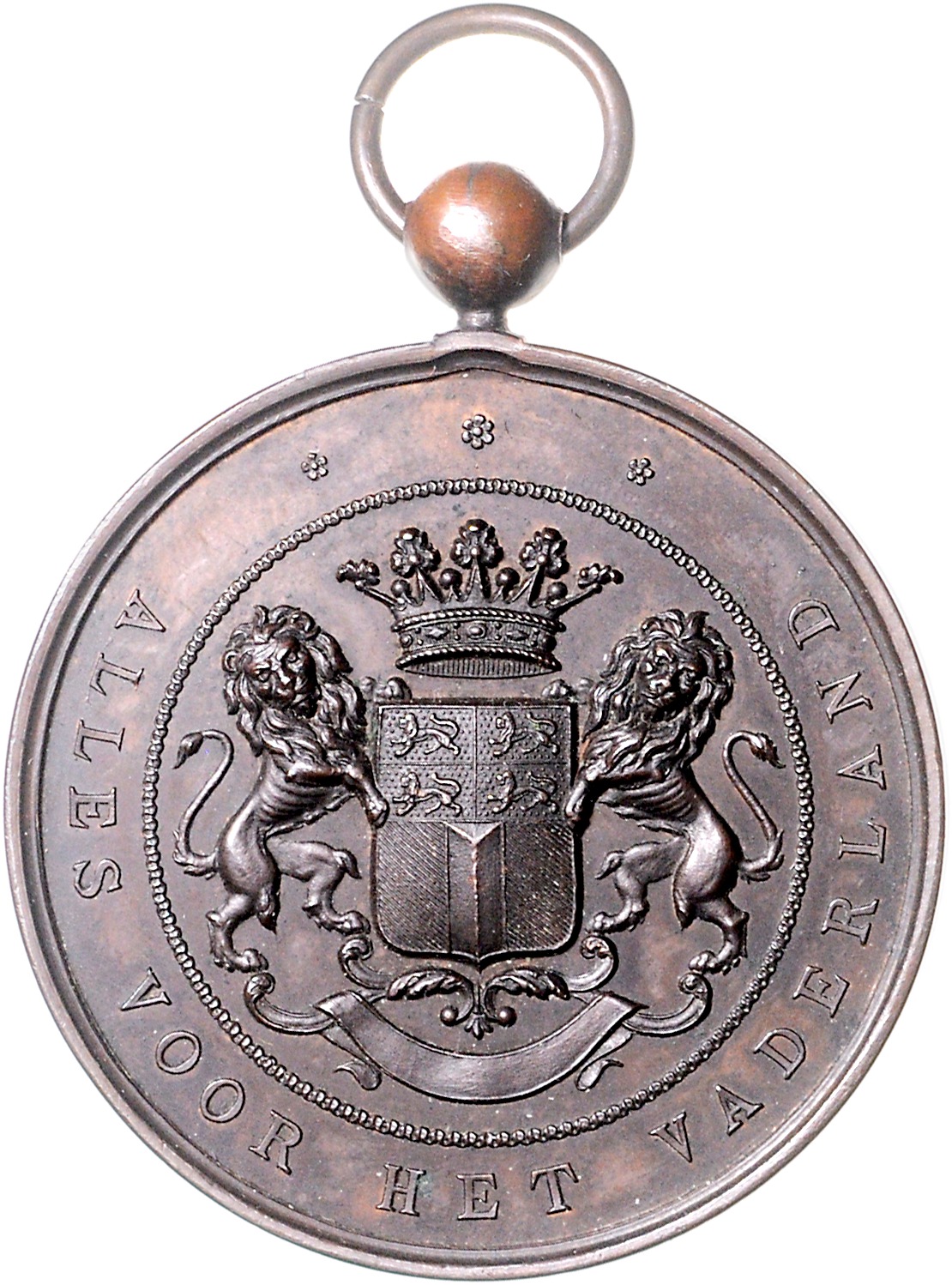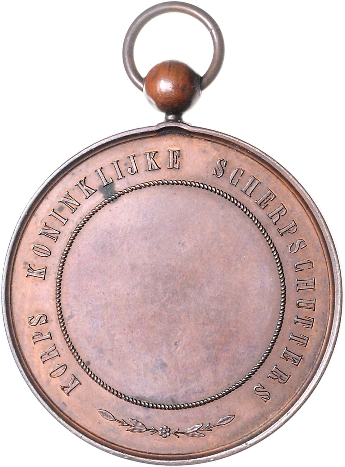 Bronzemedaille o.J. (unsign.) Prämie des kgl. Scharfschützenkorps ALLES VOOR HET VADERLAND, mit leerem Gravurfeld. mit Kugelöse u. Ring 47,6 mm, 33,86 g. vz