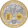 | Silbermedaille 2015 Ausschnitt aus dem Gemälde `Maschinenfabrik`, darunter das große Stadtwappen Berlins, links und rechts zwei vergoldete Medaillons der offiziellen Sondergedenkmünze auf Bismarcks 200. Geburtstag, vergoldete Umschrift 200. GEBURTSTAG OTTO VON BISMARCK *** 2015 *** / Romanischer Torbogen der aktuellen 10-Euro-Banknote, vergoldete Umschrift EUROPÄISCHE GEMEINSCHAFTSWÄHRUNG * DEUTSCHLAND *. 36,0 mm, 15,20 g. PP |