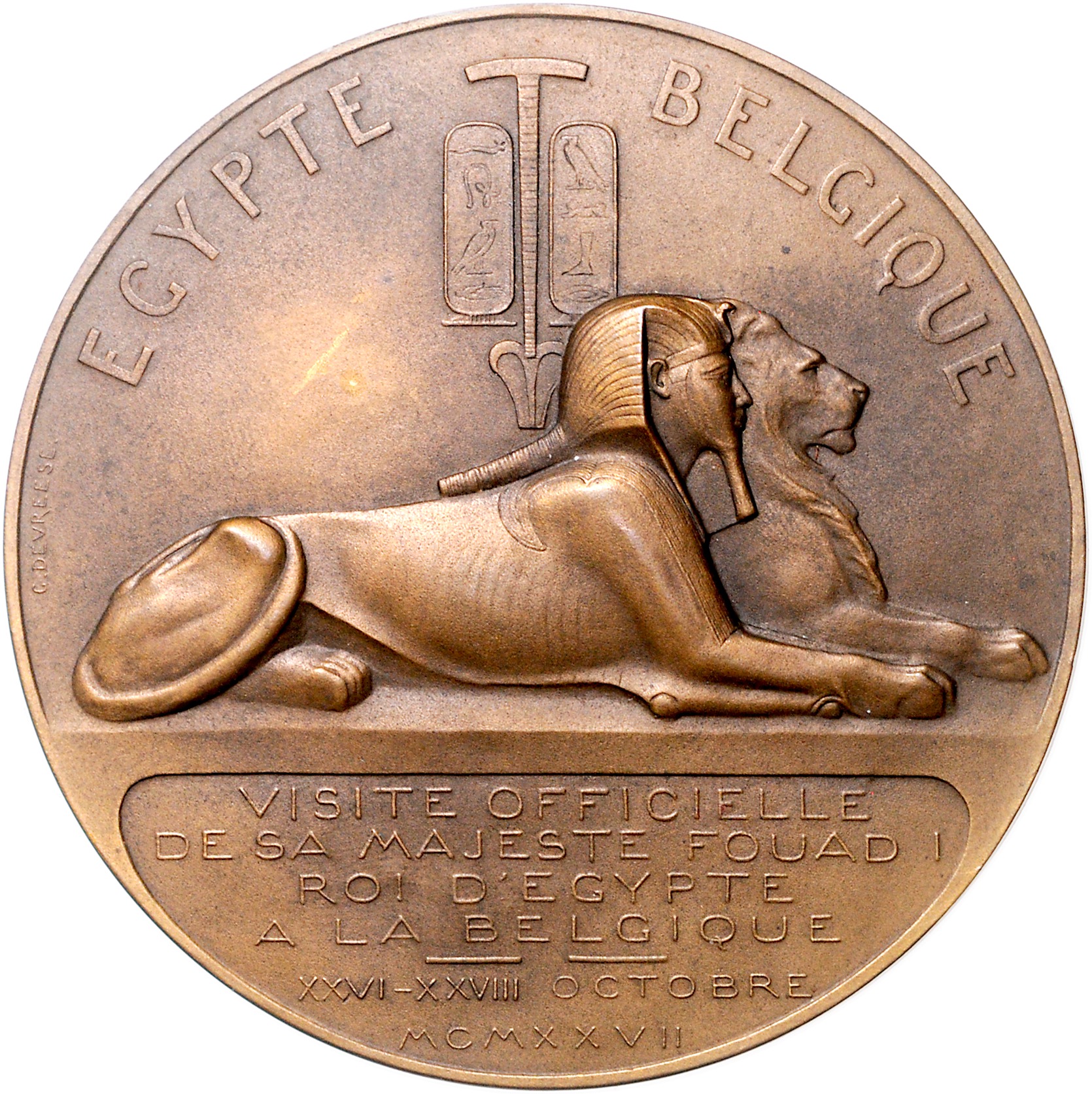 - Beschreibung: Bronzemedaille 1927 (v. Vernier/Devreese) auf den Besuch Königs Fouad I. von Ägypten in Belgien, i.Rd: Füllhorn BRONZE. Diese Medaille ist ein großartiges Zeugnis des Art-déco-Stils und des Talents der Medaillenhersteller dieser Zeit! Sie wurde 1927 in der Monnaie de Paris geprägt und ist eine der letzten Medaillen von Emile Séraphin Vernier, der im selben Jahr verstarb. Die Rückseite wurde von Godefroid Devreese, einem renommierten belgischen Graveur, gestaltet. Sie gehört zu einer Serie von Medaillen, die zur Erinnerung an die `ägyptische Königstour` geprägt wurden, eine Reihe von Besuchen des ägyptischen Herrschers Fouad I. in Europa, wobei diese Medaille anlässlich seines Besuchs in Belgien geschaffen wurde. Ägypten war damals eine `junge` Monarchie, die erst 1922 ihre Unabhängigkeit von Großbritannien erlangte und zu diesem Zeitpunkt vom Sultanat in eine Monarchie umgewandelt wurde. 72,1 mm, 154,10 g. vz