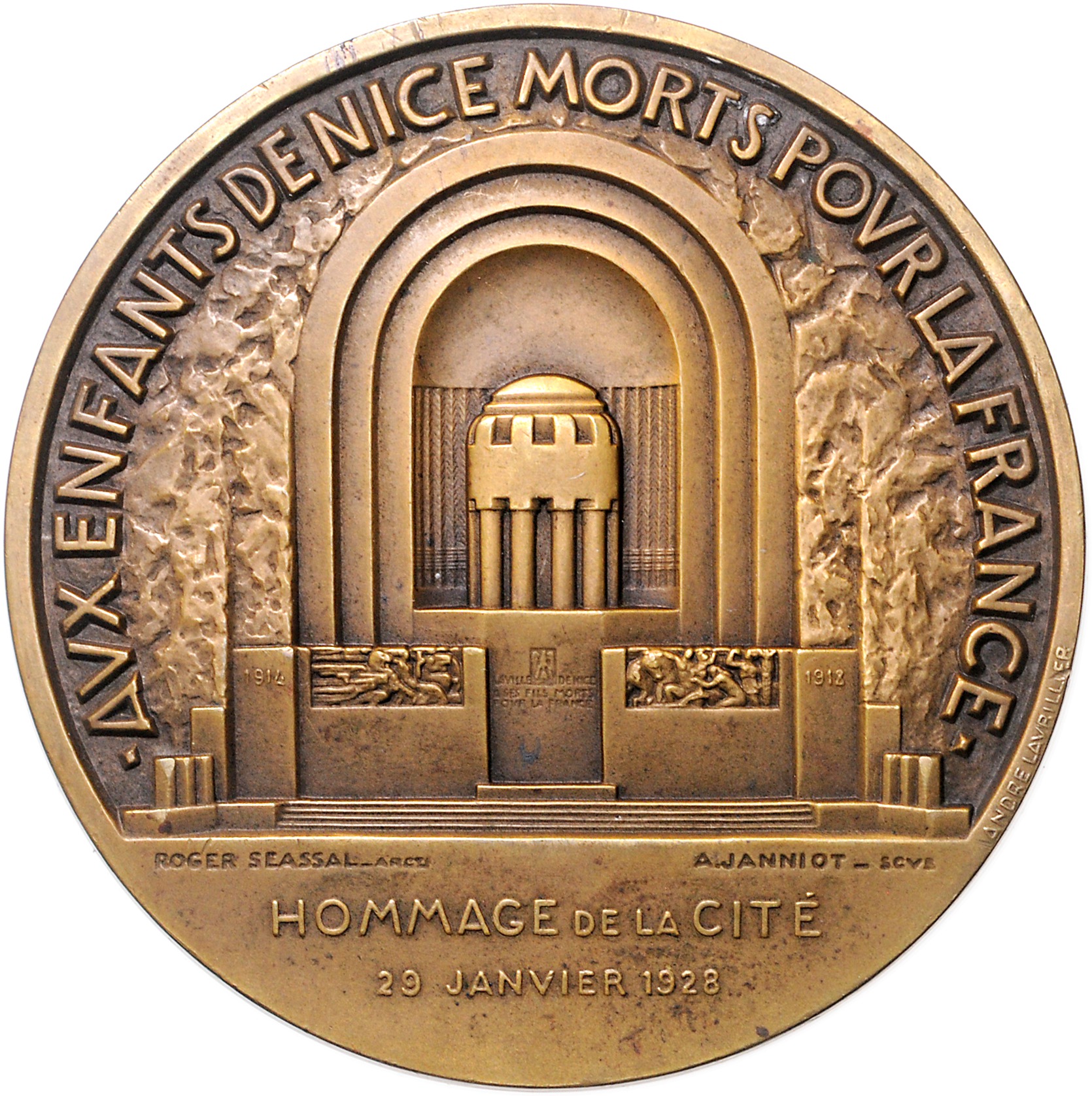 Bronzemedaille 1928 (v. Lavrillier/Janniot) auf die Enthüllung des `Monument aux morts pour la France`, i.Rd: Dreieck BRONZE. Maier 336. 72,0 mm, 181,59 g. vz