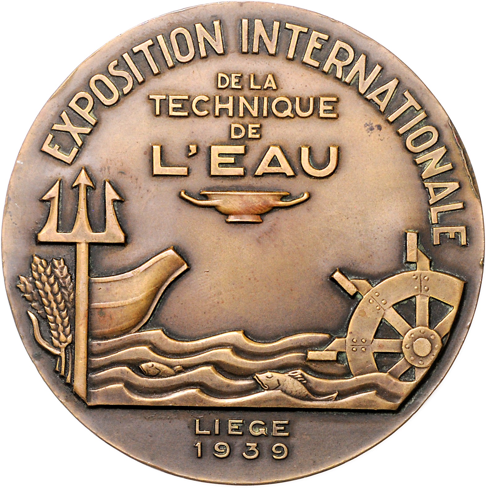 Bronzemedaille 1939 (v. Guirard) auf die Internationale Ausstellung für Wassertechnik in Lüttich, i.Rd: Füllhorn BRONZE. 67,8 mm, 151,60 g. vz