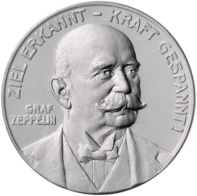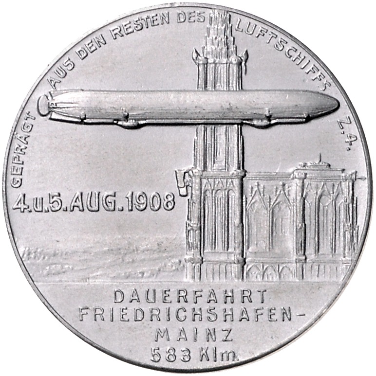 Aluminiummedaille 1908 (unsign.) aus dem Metall des Luftschiffes LZ4, das während der Dauerfahrt zwischen Friedrichshafen und Mainz bei Echterdingen verunglückte. Kaiser 303, Button 42. 33,0 mm, 5,86 g. vz-st