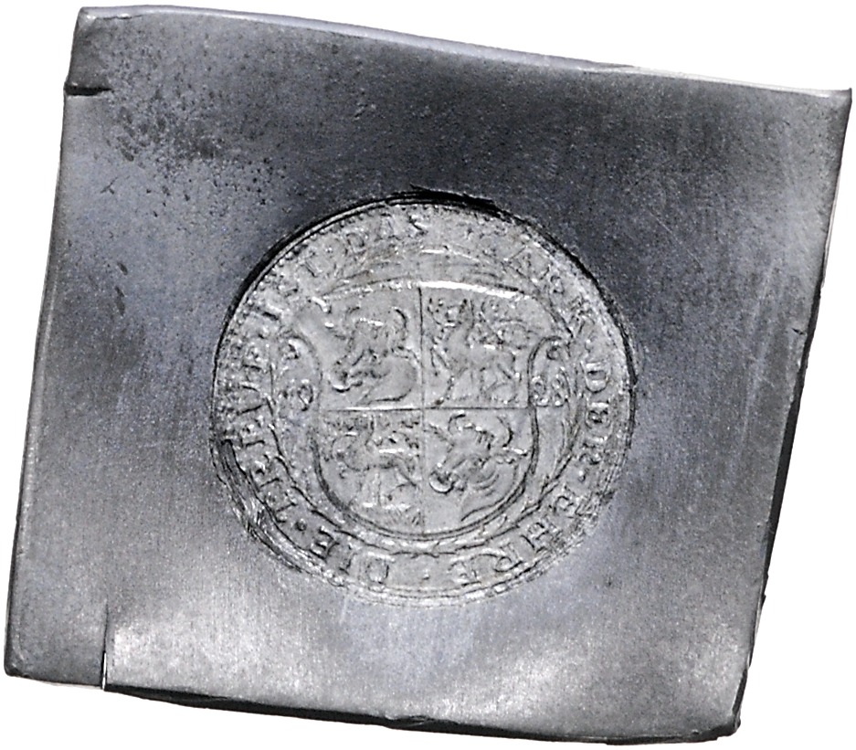 Bleiabschlag auf viereckiger Klippe der Wappenseite der Goldmarkprobe von Karl Goetz in 10 Markgröße 1928, auf den 80. Geburtstag des Reichspräsidenten Hindenburg. Kienast zu 415. 16,30 g. ss-vz