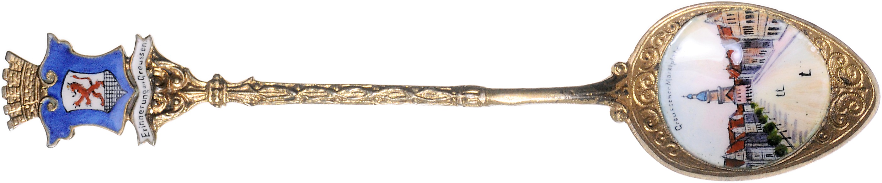 Lot von 4 Stücken: Versilberte Medaille 1908 (unsign.) auf 25 Jahre Militärverein Suhl (mit Öse) | Vergoldetes Verdienstkreuz des Krieg- und Landwehrvereins Greussen 1871 (mit Öse) | Löffel, farbig emailliert `Erinnerung an Greussen` | Emailliertes Abzeichen des Vereins der Bahnärzte der Reichsbahn Direktion Bezirk Erfurt, rückseitig Hersteller Stempel Donner, Elberfeld (mit Nadel). vz