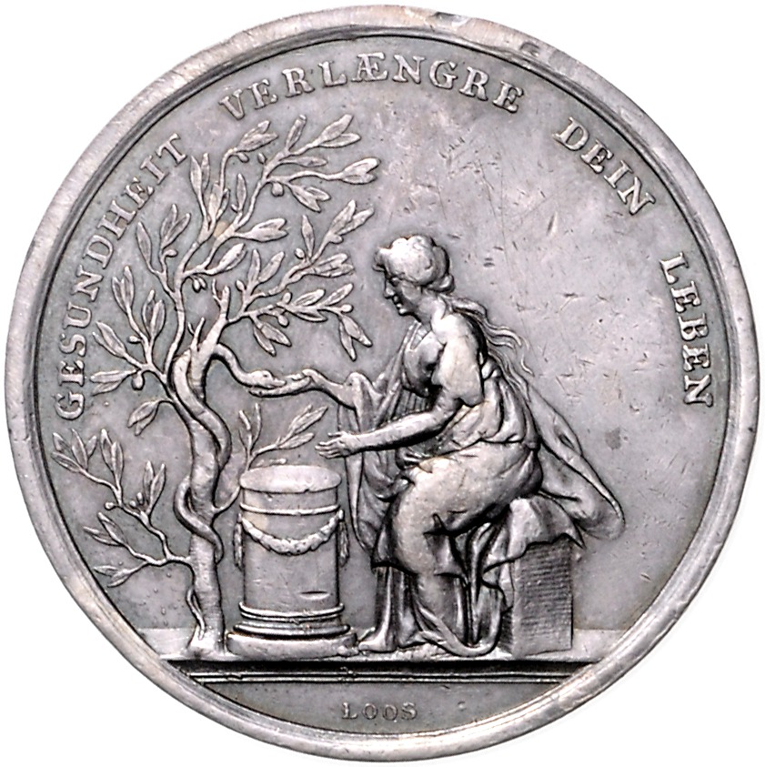 Lot von 4 Stücken: Silbermedaille o.J. (v. Loos) `Gesundheit verlängere dein Leben / und Freude verkürze die Zeit` (36,0mm 13,0g) | Silbermedaille o.J. (v. Depaulis) LA RELIGION LES UNIT, i.Rd: Füllhorn ARGENT (36,3mm 22,1g) | Silbermedaille 1879 graviert (unsign.) auf die Ehe (27,4mm 9,86g) | Messingjeton o.J. Friedrich August v. Sachsen / Liebe und Hoffnung (24,8mm 3,28g). ss und vz