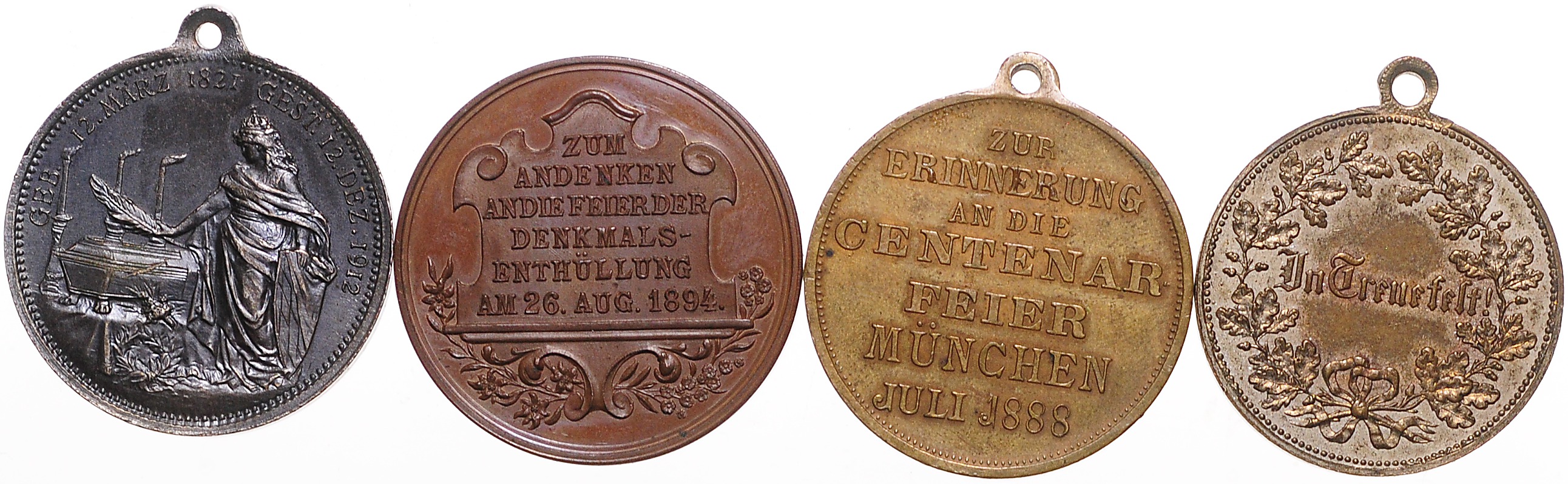 - Beschreibung: Lots. Lot von 4 Stücken Bronzemedaille 1888 (unsign.) auf den 100. Geburtstag von Ludwig I. 30,2mm 14,26g, mit Öse | Bronzemedaille 1894 (v. Drentwett) auf die Denkmalsenthüllung für Ludwig II. in Murnau. 31,8mm 14,67g | Versilberte Bronzemedaille o.J. (unsign.) Luitpold `In Treue fest`. 28,7mm 10,72g, mit Öse | Geschwärzte Bronzemedaille 1912 (v. Lauer) auf den Tod von Luitpold. 30,4mm 15,39g, mit Öse. ss bis f.st