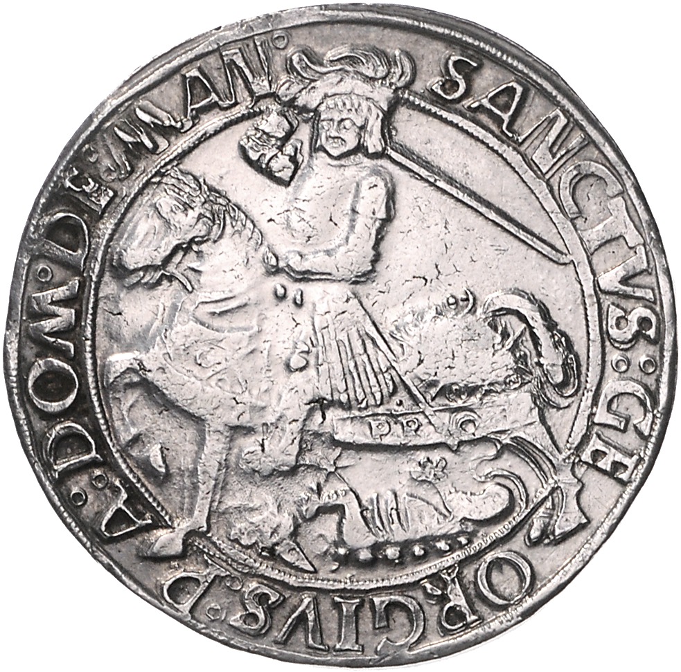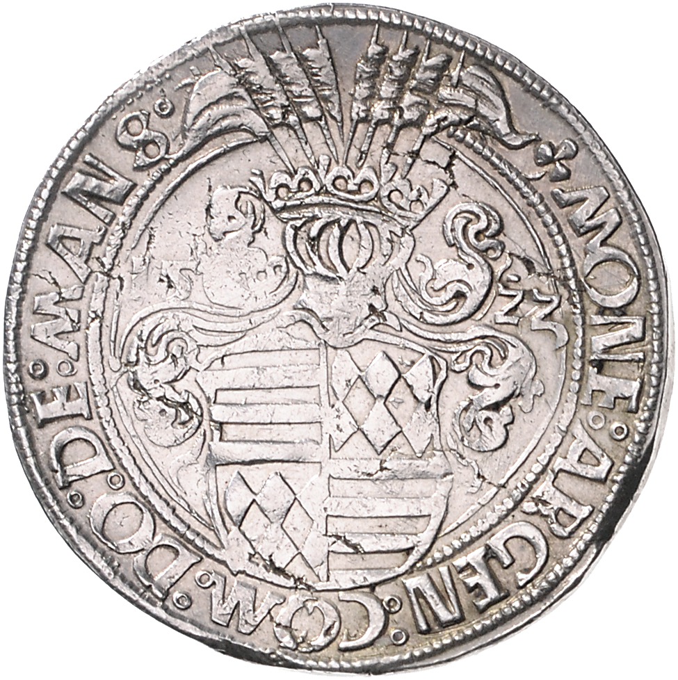 Günther IV. und seine 4 Brüder 1486-1526. Taler 1522 Eisleben. Tornau 59 f, Davenport 9471. kl. Sf. am Rand, gereinigt, selten 29,30 g. ss+