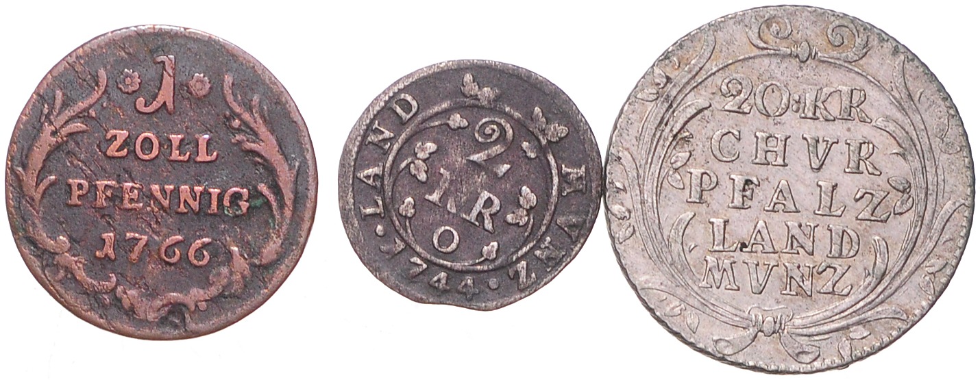 Karl Philipp 1716-1742. Lot von 3 Stücken: 20 Kreuzer 1727 | Zollpfennig 1766 | 2 Kreuzer 1744. Slg. Noss 358, 451, 458. ss