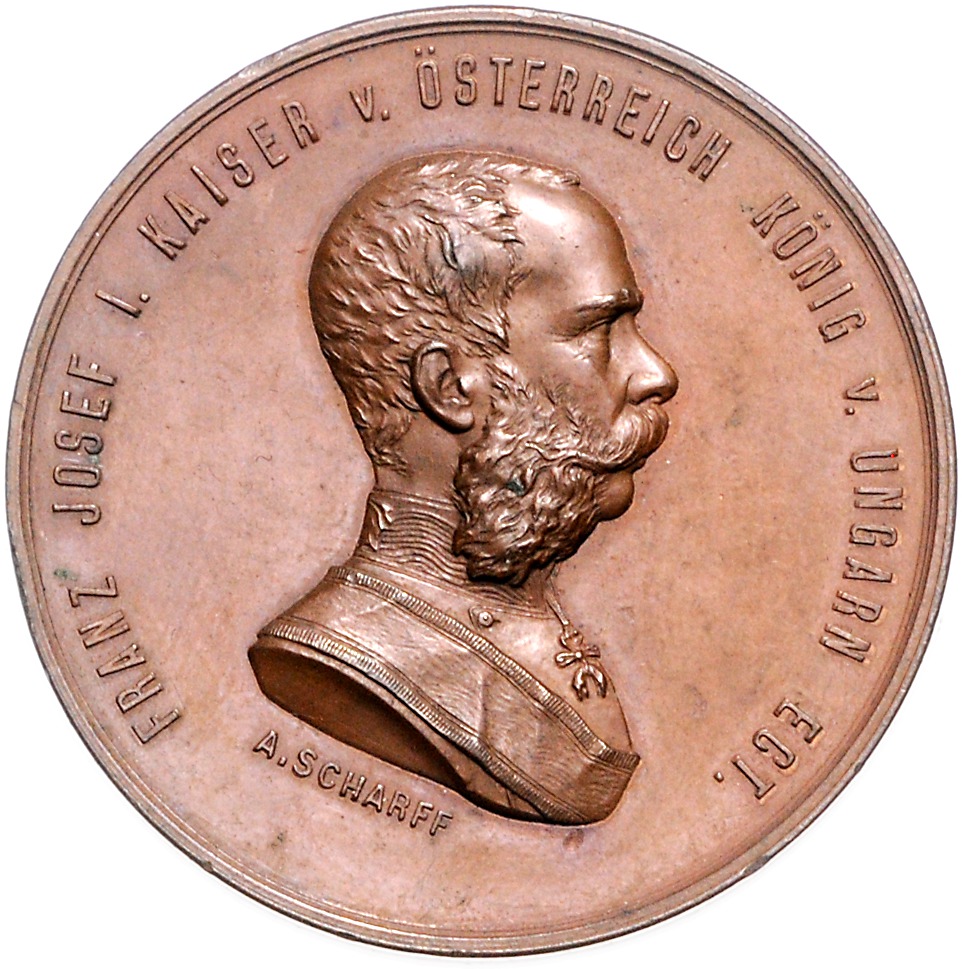 Lot von 2 Stücken: Bronzemedaille 1868 auf Franz Bauer, Bildhauer und Professor der K.K. Akademie der Bildenden Künste, gewidmet von seinen Schülern. 39,7mm 30,62g, winz. Fl. | Bronzemedaille 1873 auf die Weltausstellung in Wien. 41,4mm 29,11g, kl.Rf., frz. geprägt. Hauser 2876, Wurzbach 571, 2488. vz-st und vz