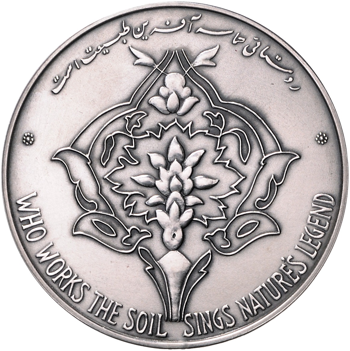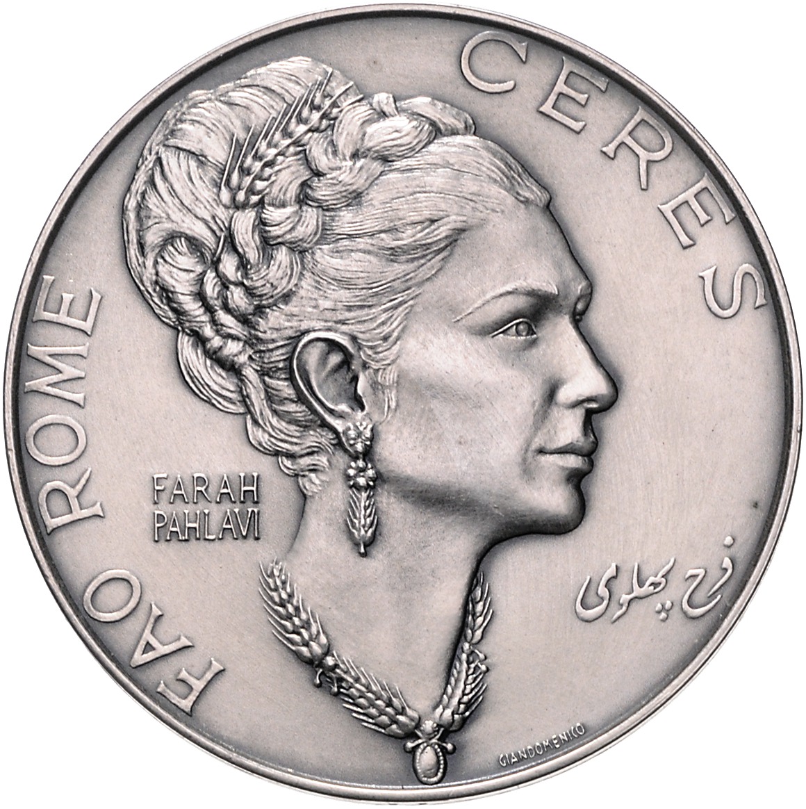 Mohammed Reza Pahlevi, Shah 1941-1979. Silbermedaille o.J. (v. Giandomenico) auf Farah Diba Pahlevi und ihre Förderung des landw. Kunsthandwerks und der Entwicklung der Landwirtschaft, i.Rd: 925 und 1AR. mattiert 50,0 mm, 49,70 g. st