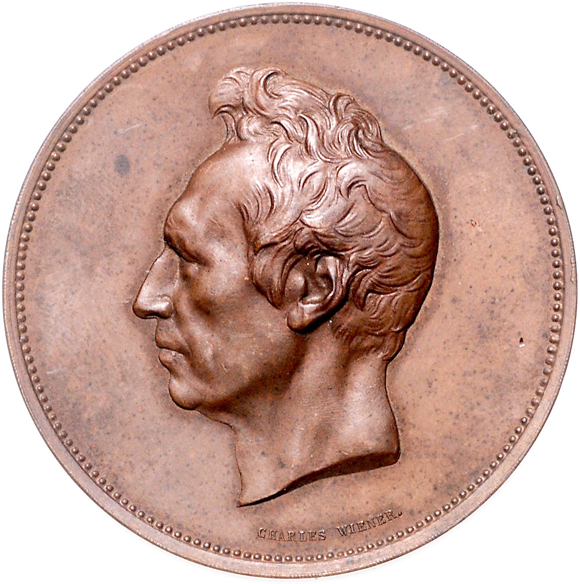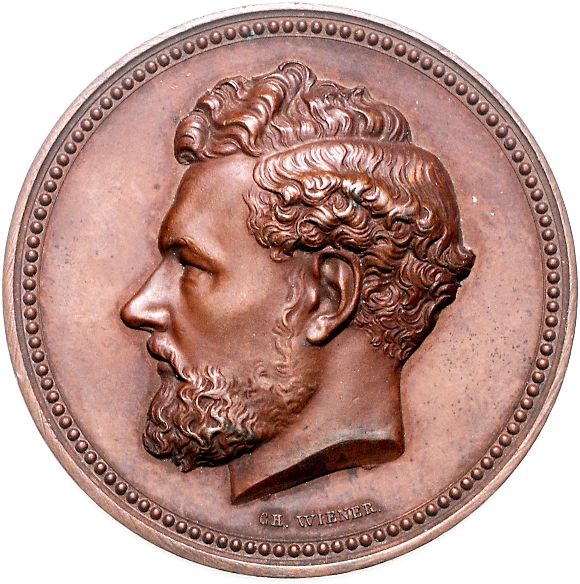 Lot von 3 Bronzemedaillen (v. Charles Wiener) 1869 auf Pierre van Humbeek, Politiker und Minister (vz 50,9mm 48,84g) | 1878 auf B.C. du Mortier, Botaniker und Finanzminister (f.vz 49,7mm 43,66g) | 1868 auf Bürgermeister J.A. Mullie (ss-vz, kl. Rf. 50,7mm 54,1g). ss-vz bis vz