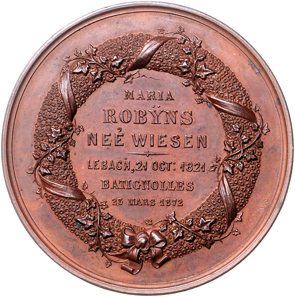 Bronzemedaille 1872 (v. Charles Wiener) auf den Tod von Maria Robyns, geb. Wiesen (Lebach 21. Oct. 1821-23. März 1872 in Paris-Batignolles). 50,5 mm, 44,36 g. vz