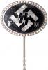 | Schwarz emaillierte Anstecknadel mit Hakenkreuz und SS-Runen und FM (Förderndes Mitglied), rückseitig mit Verleihungsnummer C 30618 und Hersteller Deschler, München. vz |