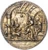 | Vergoldete Silbergussmedaille o.J. (v. Fecher) auf die Anbetung Jesus durch die Heiligen Drei Könige. (Diese Medaillenseite entspricht exakt einer Darstellung aus der Werkstatt Milicz) / Stadtansicht von Basel. mit altem Beschreibungszettel der SBV Basel, Hklsp. 42,3 mm, 15,86 g. ss |