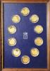 | Wandbild in Holzrahmen mit vergoldeter Zierleiste, blauer Hintergrund und mittig silberfarbenes Bismarcksches Fürstenwappen umrahmt im Oval mit 10 vergoldeten Silbermedaillen auf den Werdegang Bismarcks. 1862 BISMARCK WIRD MINISTERPRÄSIDENT | 1866 SCHLACHT BEI KÖNIGGRÄTZ | 1870 BISMARCK UND NAPOLEON III. BEI SEDAN | 1871 REICHSGRÜNDUNG IN VERSAILLES | 1872 DREIKAISERPOLITIK | 1874 KULTURKAMPF-ATTENTAT AUF BISMARCK | 1878 BERLINER KONGRESS | 1881 VORBEREITUNG DER SOZIALGESETZE | 1888 FRIEDENSREDE IM REICHSTAG | 1890 BISMARCKS ENTLASSUNG Die Rückseiten alle mit dem gekrönten Bismarckschen Fürstenwappen und Faksimileunterschrift Bismarcks sowie Zitaten zu den gegebenen Anlässen. Im Rand jeder Medaille: 24 K GOLD AUF SILBER 925/1000 und 4 Punzen ERSTAUSGABE NR. 260x370mm, mit Aufhängevorrichtung. PP |