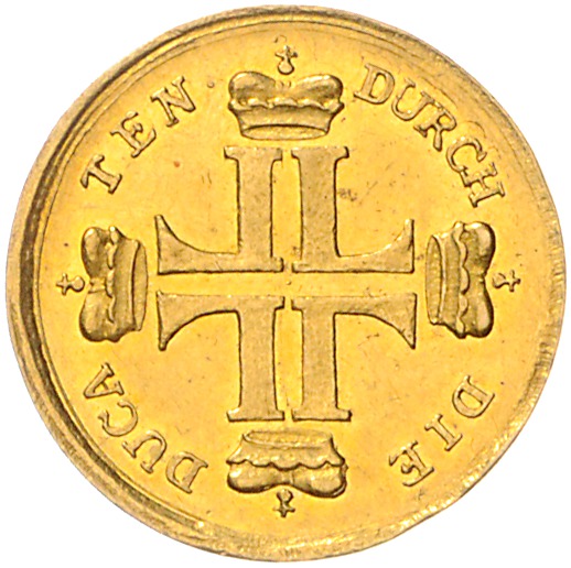 Ludwig VIII. 1739-1768. Dukat o.J. (ab 1763) sog. `Hirschdukat`. Schütz 3130, Friedberg 1225, Müller 3602. mit leichten Justierspuren am Rand, Prachtexemplar 3,37 g. f.st