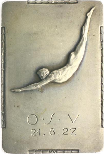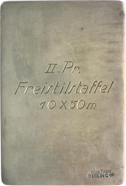 Bronze-Plakette 1927 versilbert (v. Timm, Berlin) 2. Preis der Freistilstaffel 10x50m des O.S.V. 21.8.27 kl.Fleck, Patina 41,0x60,6mm 55,2g f.vz